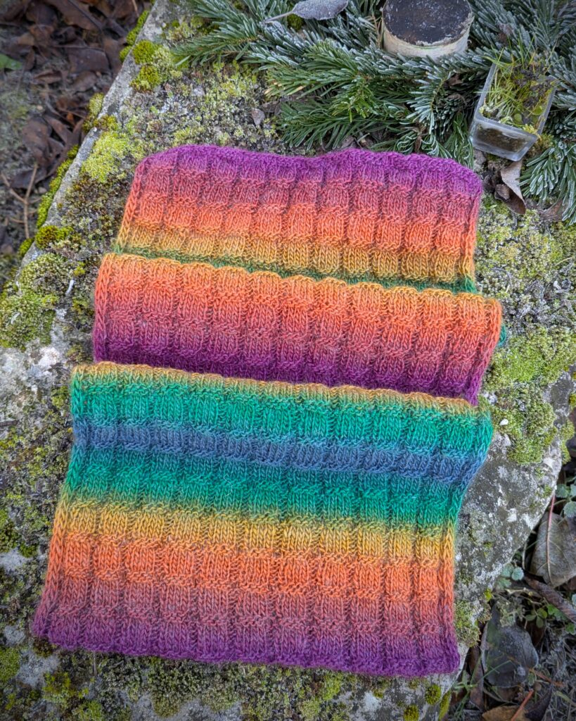 Ich habe hierfür 74 Maschen angeschlagen. Gestrickt mit NS 4mm. Eingerahmt habe ich es mit einem I-Cord Rand über je 3 Maschen, dann einfach die gewünschte Länge gestrickt und die Enden zusammengenäht.