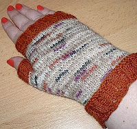 Brauchte zu meinen ersten beiden Mützen noch Handstulpen. Versuchte mich zu ersten Mal an welchen mit Daumen. Das Muster für die Borte stammt aus dem Buch “bündchen & bordüren” von Nicky Epstein (S.154/kleine Muscheln)