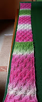 Die Bilder zeigen den Schal am Anfang und aktuell in gespanntem Zustand. Ein Foto nach dem Spannen wird folgen.