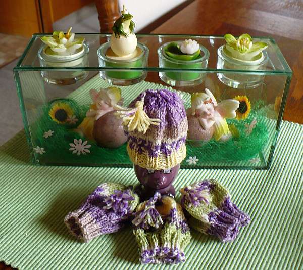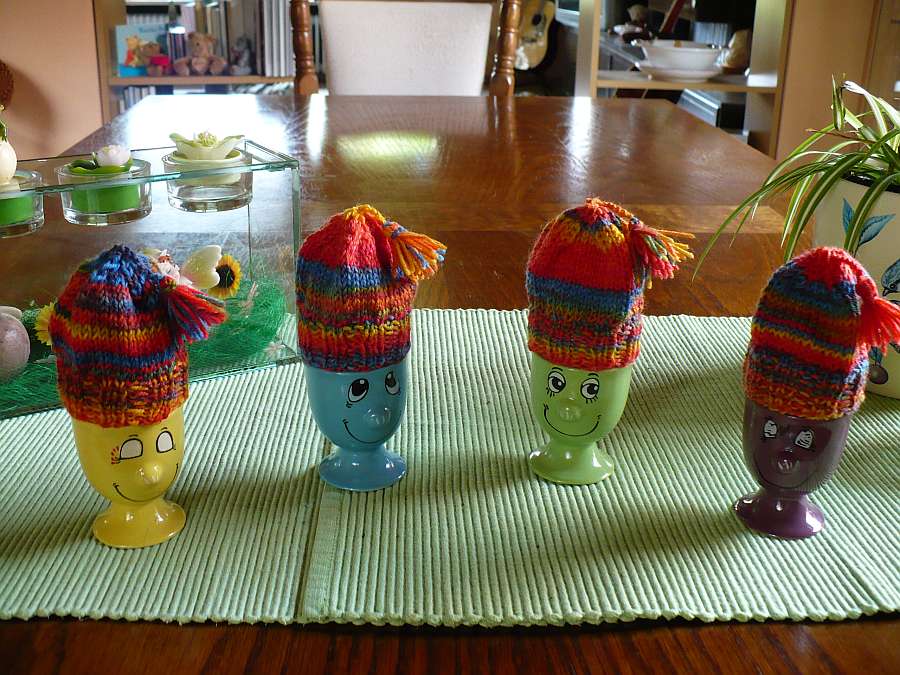 Brauchte ein schnelles und originelles Geschenk, da fielen mir Eierwärmer ein. Gedacht, versucht, erster Versuch gestern Abend auch direkt geglückt.