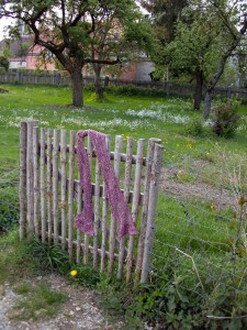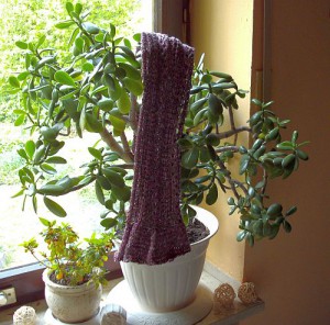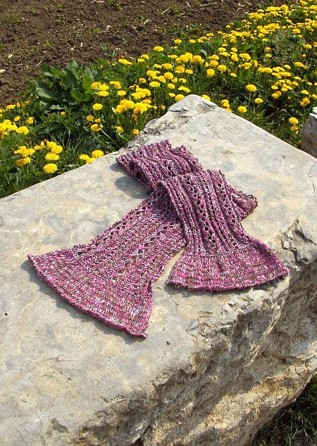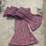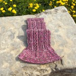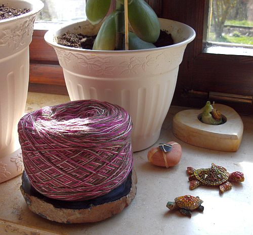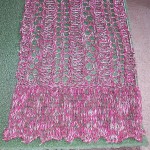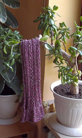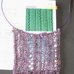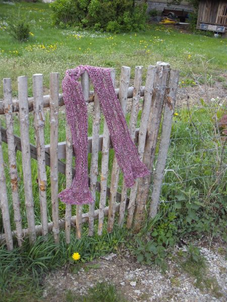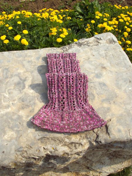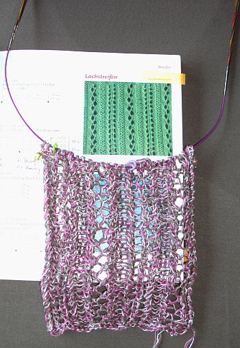 Das Muster habe ich dem Buch “Omas Strickgeheimnisse” entnommen (S.15 “Lochstreifen aus Konnersreuth”), das Garn ist gefachtes Garn von Selavi . Es besteht aus 2 fuchsiafarbenen Fäden, 2 in einem Khakiton und einem Faden in hellem Rosa. Für ein luftigeres Maschenbild habe ich 3,75er Nadeln verwendet.
