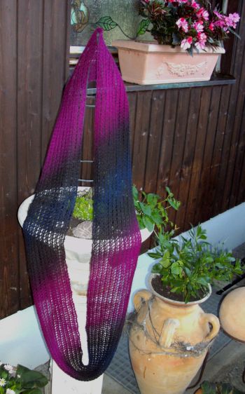 Freie Anleitung bei Ravelry: Infinity Scarf aus einem Zauberball “Charisma” von Schoppel. Verbrauch: 83g Maße: 19cm x 210cm.