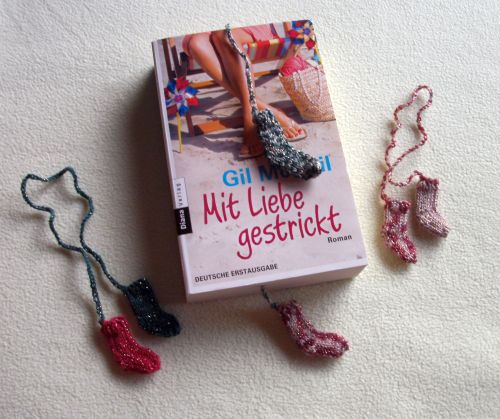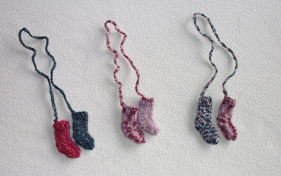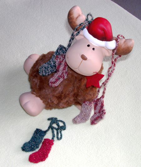 Pro Söckchen habe ich gerade mal 12 Maschen angeschlagen (Nadelstärke 2,25 bei Sockenwolle) und jedes mißt in der Breite 1,5cm und in der Höhe knapp 4cm.