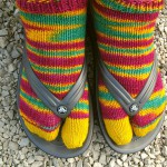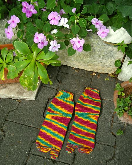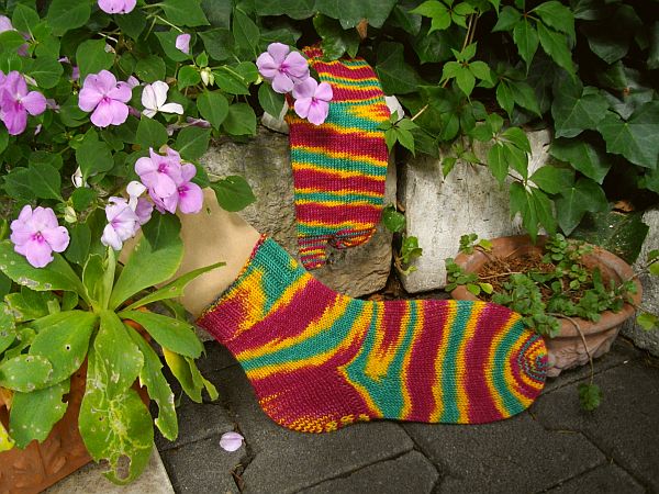 Habe mir aus dem Rest noch FlipFlop-Sneakers-Söckchen gestrickt, mit kontrastfarbener Spitze und Zehe (da sonst das Garn nicht ganz gereicht hätte). Sieht witzig aus, wie ich finde! 🙂