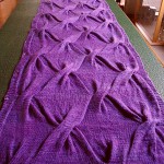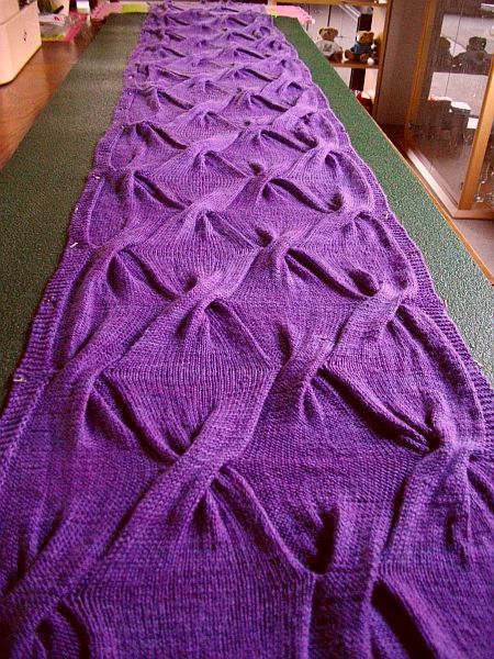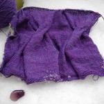 Ich habe 134M angeschlagen, 7 Reihen (ich mag lieber ungerade Zahlen und die 7 ist eh meine Lieblingszahl ;D ) kraus rechts für den unteren Rand gestrickt und je 7 Randmaschen.