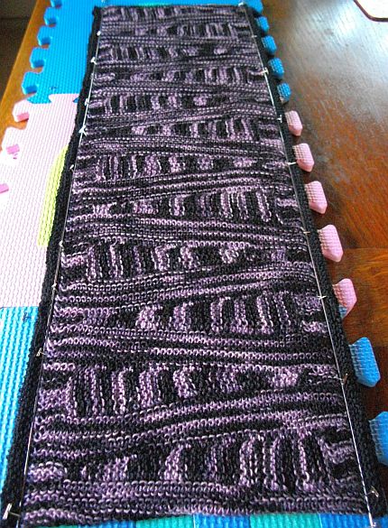 Ich habe beim Stricken die Länge immer wieder an einem  meiner Lieblings-Cowls verglichen und kam so auf 24 Keile (anstatt der 26 in der Anleitung). Habe mich auch beim Spannen an diesen Maßen orientiert, da ich ihn keinesfalls länger haben wollte.