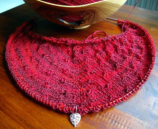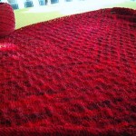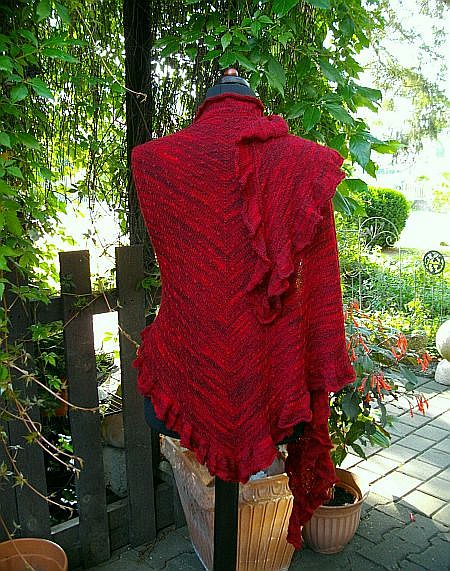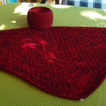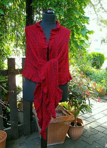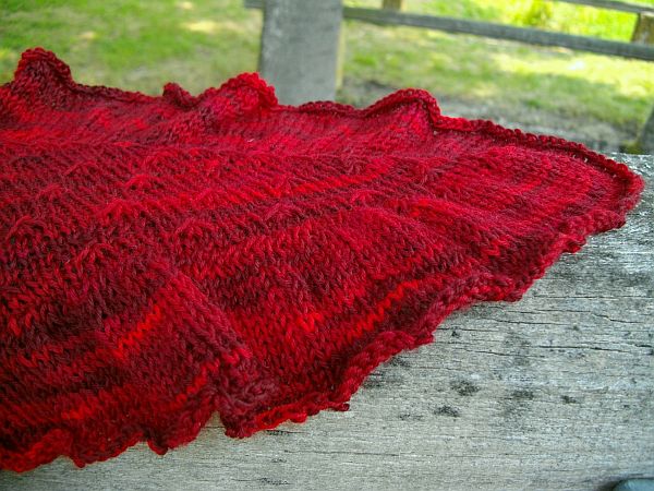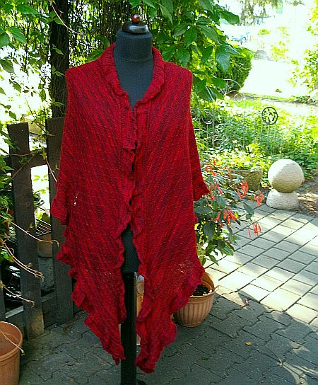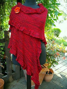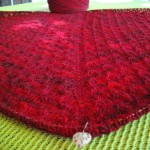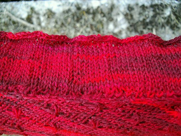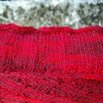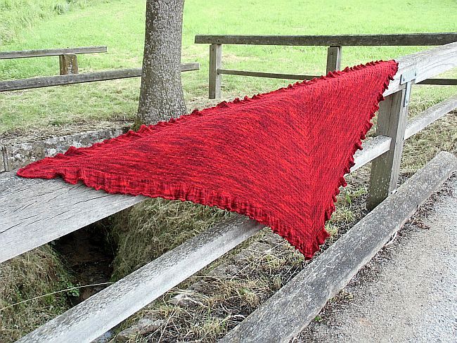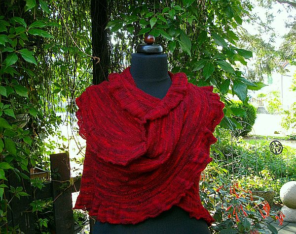 Um die Rüsche hatte ich mir viele Gedanken gemacht, da mir das Muster aus der Anleitung zu unruhig ist. Die von einigen gewählte 2re/2li Variante gefällt mir grundsätzlich schon, aber erschien mir für diese Färbung nicht passend, da zu “nüchtern”. Für dunklere Garne (petrol, grau…..) ideal, aber für dieses rote Garn wollte ich es etwas verspielter, aber nicht ganz so “kringelig” wie beim Nuvem.