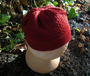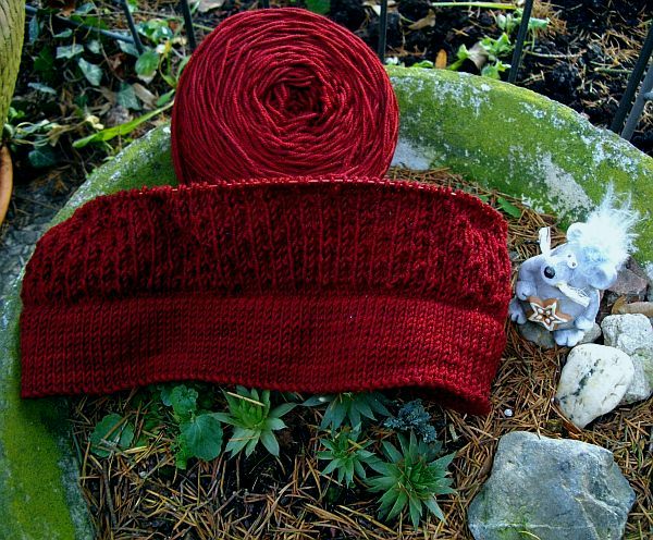 Bei der Mütze (120M) habe ich das Bündchen doppelt gestrickt (wie beim “Wurm”) – also 13 Runden rechts, 1 Runde links, 13 Runden rechts, dann zusammengestrickt, 12 Zunahmen gleichmäßig verteilt über die Runde und dann mit dem “Herminen-Muster” begonnen.