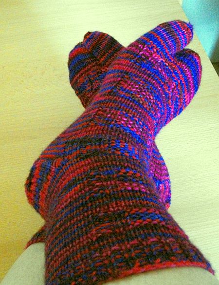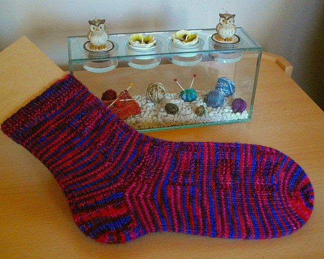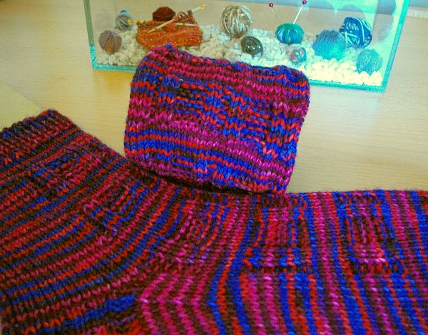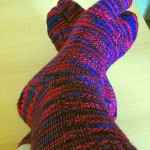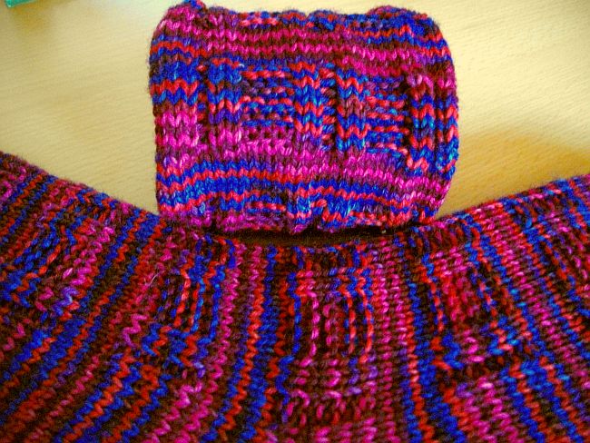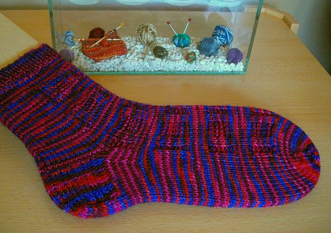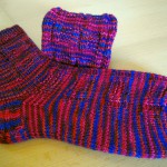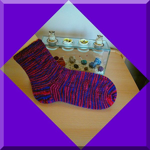 Und weil mir das Stricken von Stinos zu langweilig erschien (hört hört – und das aus meinem Munde! lach) ließ ich mir während des Strickens ein kleines Muster einfallen. Ich mag das Ergebnis ☺ (auch, wenn die Farben leider nicht wirklich gut im Bild einzufangen waren. Was hier blau aussieht, ist tatsächlich ein schön sattes Lila).
