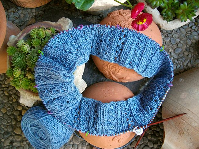 Ich verzichtete auf das Bündchen (mag ich nicht so gerne von der Wirkung her) und begann direkt mit dem Muster.