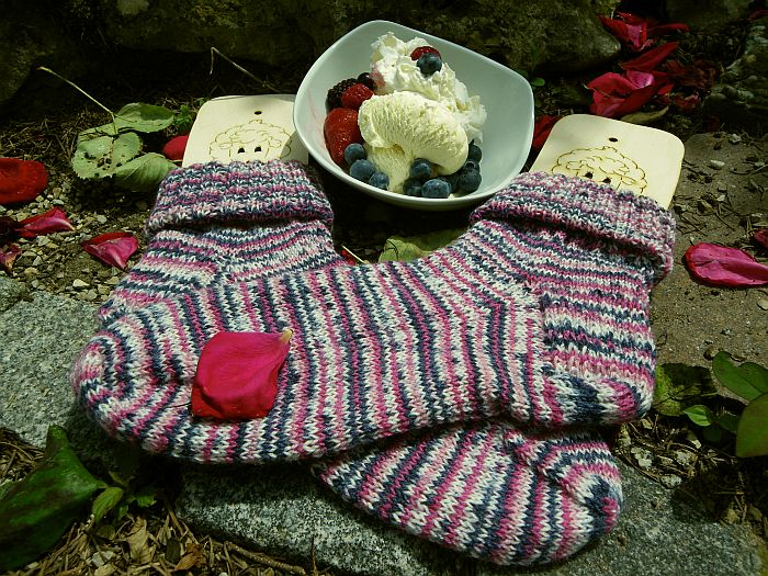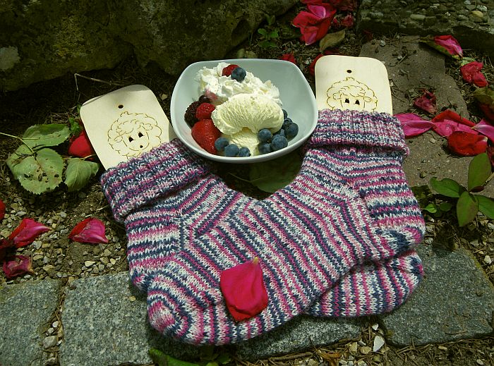 Auf den letzten Drücker habe ich es noch geschafft auch an der Juni-Sockenreise der “Auf Socken durch die Welt” Gruppe bei Ravelry teilzunehmen. Die Reise führte diesmal ins schöne Italien. Und da mich die Farben des Garns an Vanilleeis mit Beeren erinnerte, lag der Arbeitstitel nahe….^^