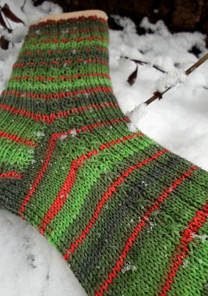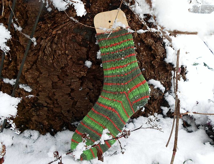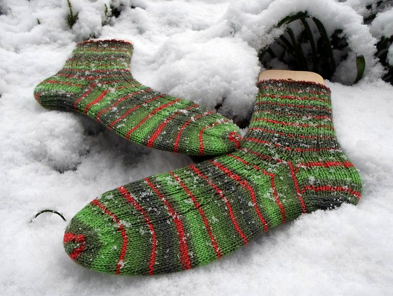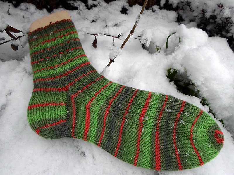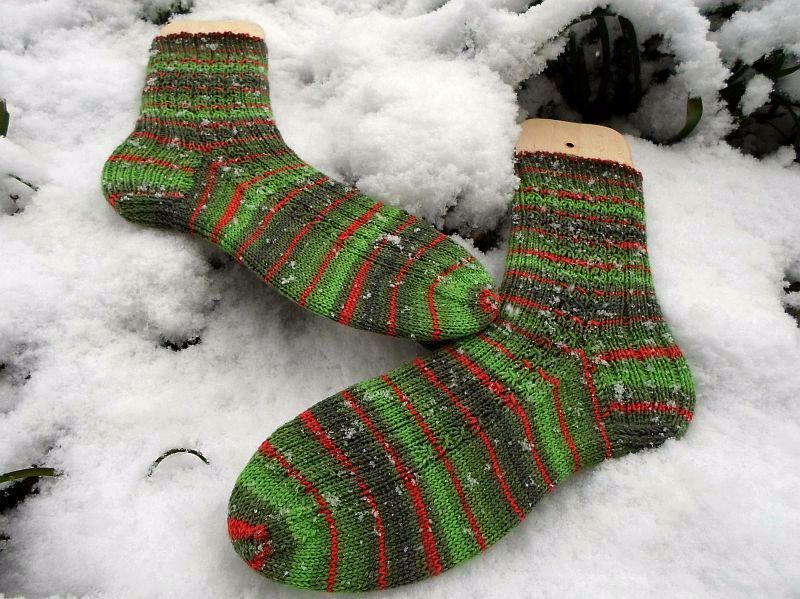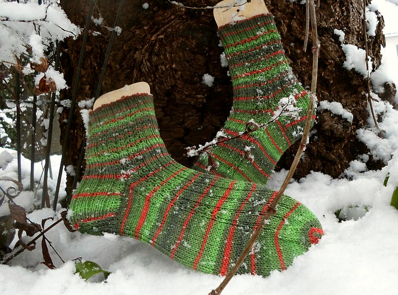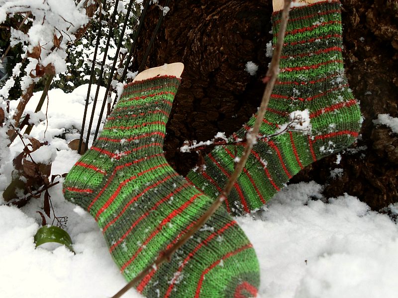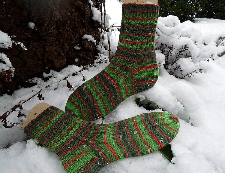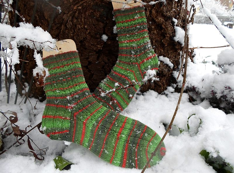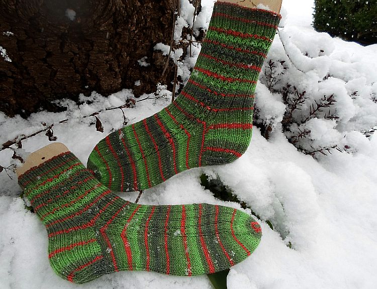 Und gerade als ich gestern den letzten Faden vernäht hatte, setzte hier ein spontaner Wintereinbruch ein, was ich direkt nutzte die fertigen Socken im frischen Schnee zu knipsen. Ein paar Stunden später war die Pracht auch direkt wieder verschwunden.