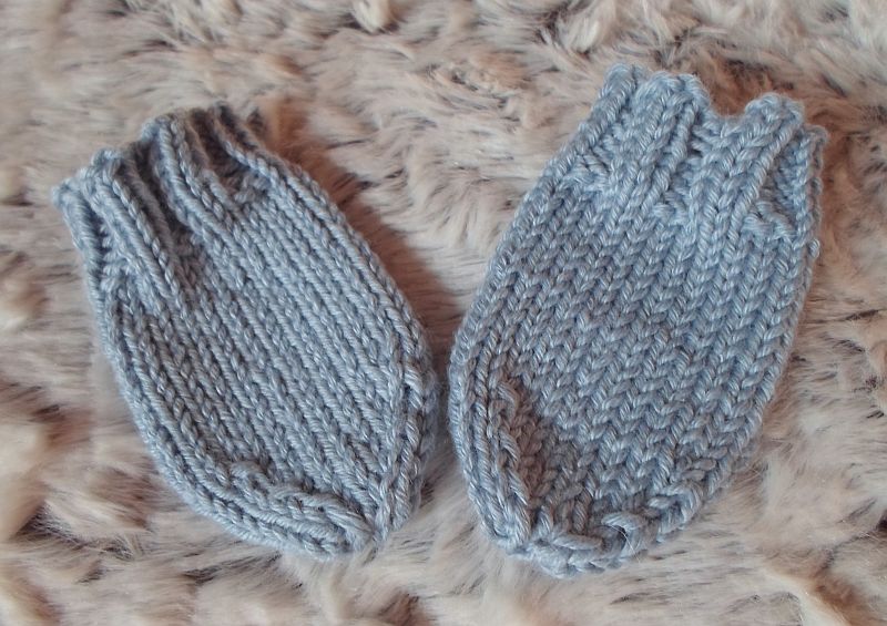 Für die kleinen Fäustlinge habe ich mit NS 2,5mm 24 Maschen angeschlagen, Bündchen 2 re/2li über 8 Runden. Weiter glatt rechts über 16 R.