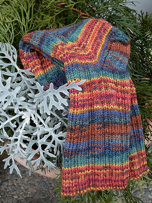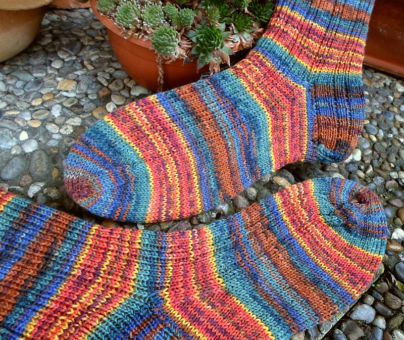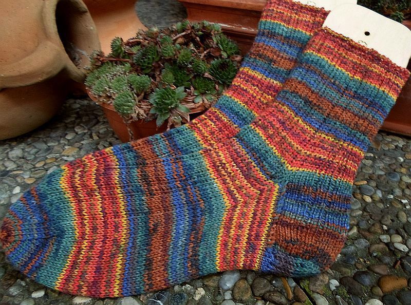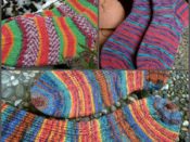 Und das Paar in den schönen Herbsttönen habe ich mit einem kleinen Streifenmuster versehen – bei 64 Maschen wie folgt: 1re/1li, 4re, 1li/1re (fortlaufend).