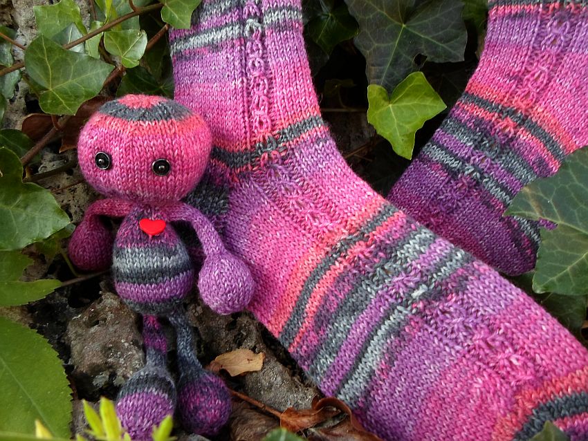 In die Socken habe ich je einen der “Feuerland-Zöpfe” aus dem Verena Spezial “In 80 Socken um die Welt” Heft eingearbeitet, da es an das Infinity Zeichen erinnert, was für dieses Geschenk von besonderer Bedeutung war.