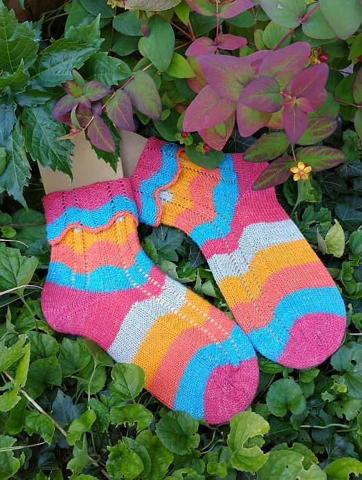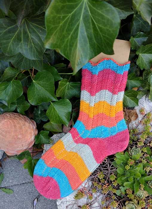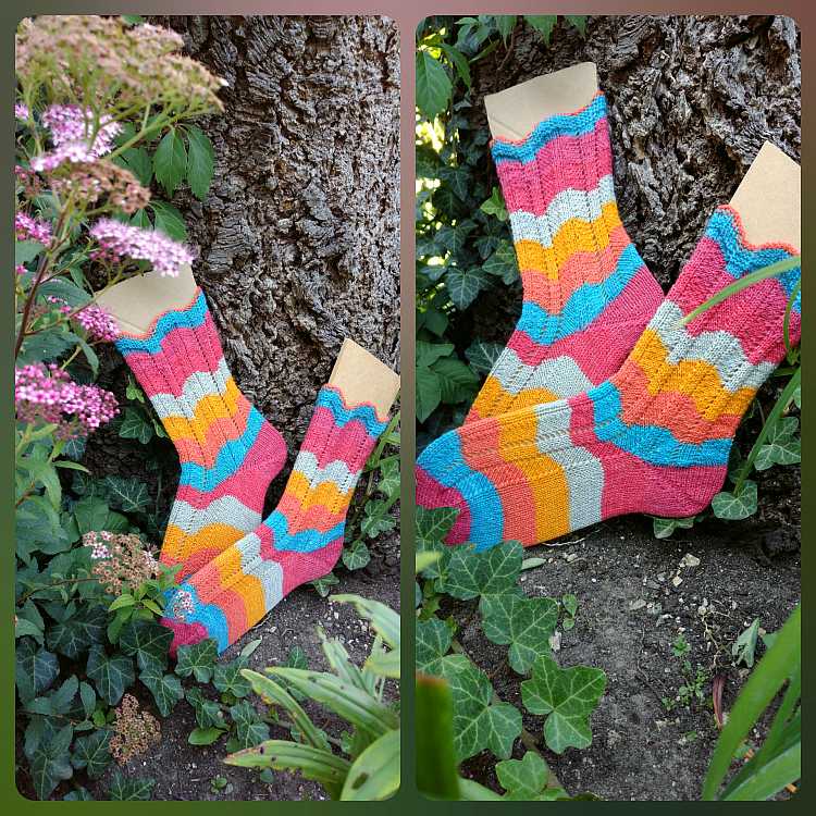 Ja und dann….irgendwie gefiel es mir immer besser und letztendlich so gut, dass ich dieses Sockenpaar nun für mich behalte. Schon witzig, welche Entwicklung die Dinge manchmal nehmen. Das ging mir nun schon einige Male so, dass gerade die Knäuel die mir am Anfang nicht so wirklich gefielen, sich während des Strickens zu Lieblingen entpuppten. Aber besser so als anders herum. ;-))