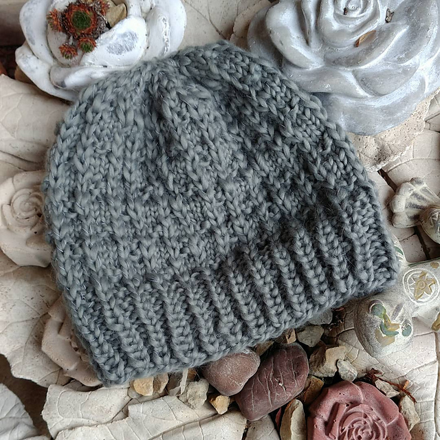 Die graue Mütze für meinen Mann habe ich total improvisiert, mit Hebemaschen und versetztem rechts/links Muster.