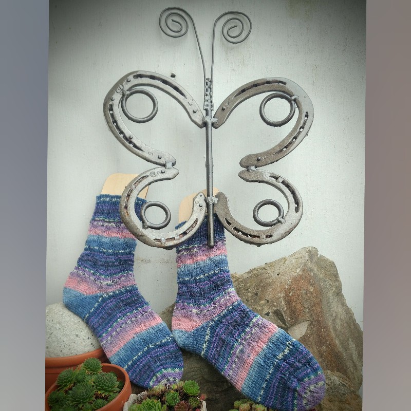 Sockenpaar Nummer 3 ist gestrickt nach der ebenfalls kostenfreien Anleitung “Ein Hauch von Nichts” von Melly A. Mathews (Ravelry), aus einem 6-fach Garn von Opal aus der Kollektion Daydream in der Farbe “Inspiration” (von 2014).