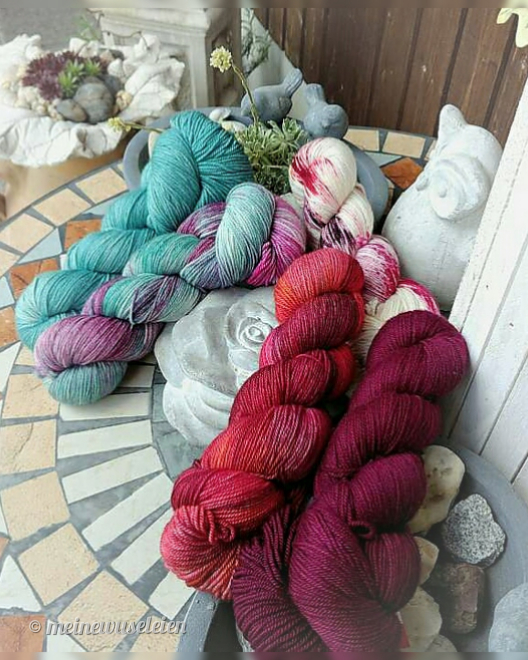 Farbe 1: Green Tea Farbe 2: Dragonfly Farbe 3: Splatter Farbe 4: Red Wine at Sunset Farbe 5: Dragonfruit (erhältlich z.B. im bereits erwähnten Wollshop “Lanaphilia”…in vielen weiteren schönen Farben!)