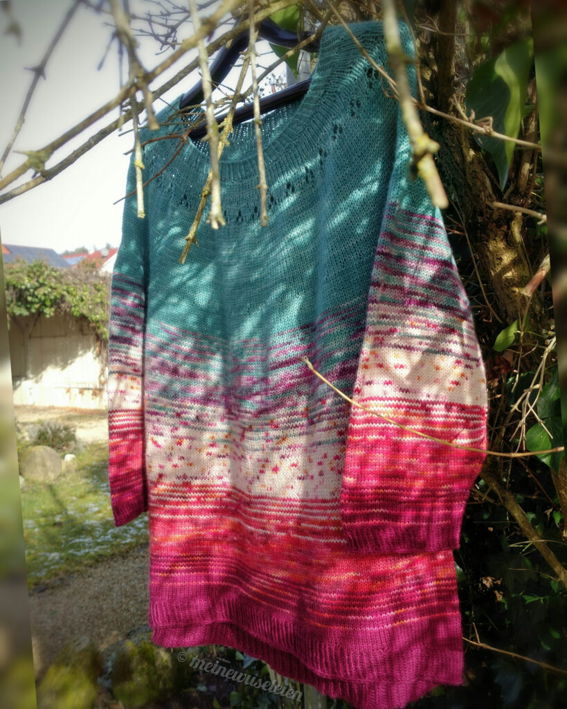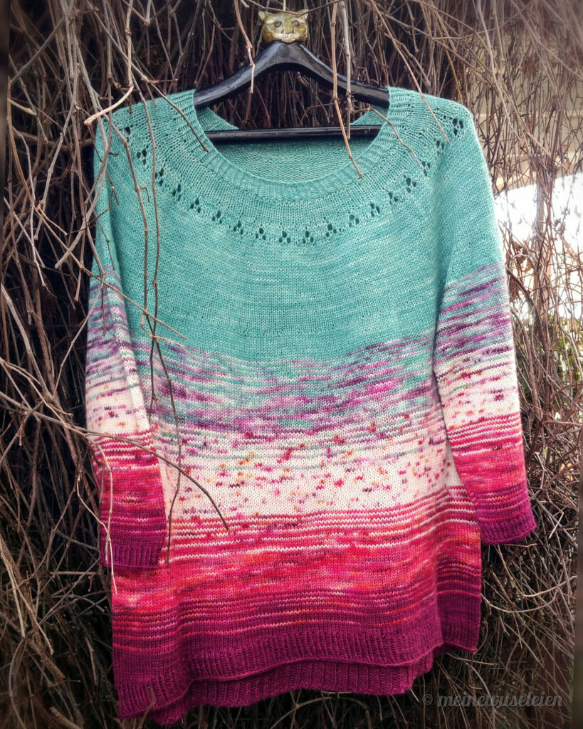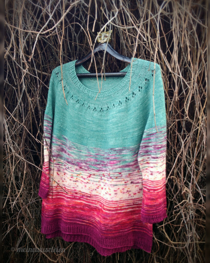 Das Lochmuster habe ich ebenfalls aus der “Ingalls” Anleitung übernommen, ansonsten wollte ich hier aber vor allem die Farben der einzelnen Stränge für sich stehen und wirken lassen. Und da es eher ein Pullover für nicht ganz so kalte Tage werden sollte, entschied ich mich für 3/4 Ärmel.