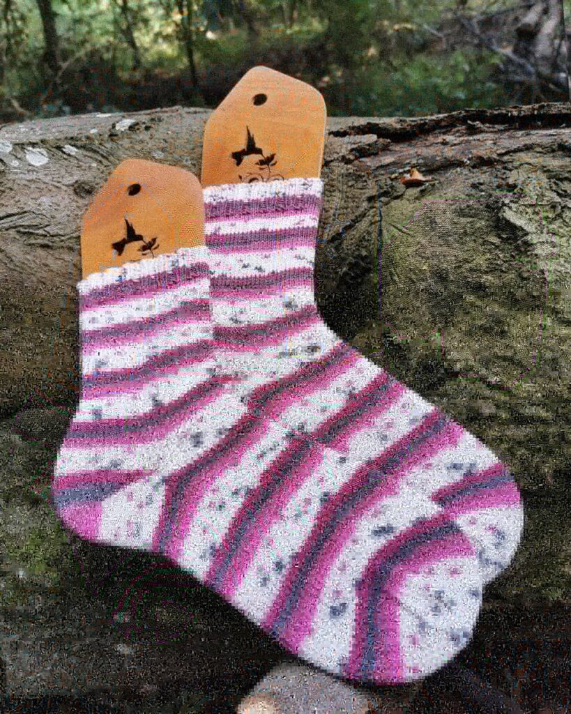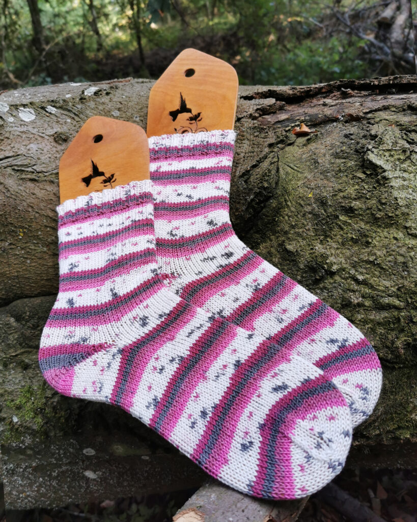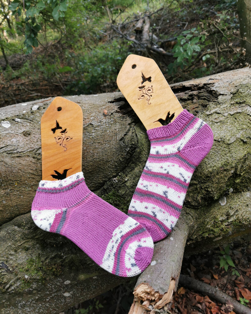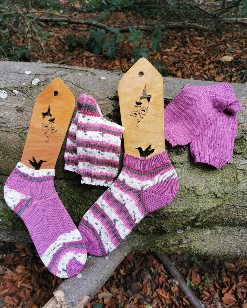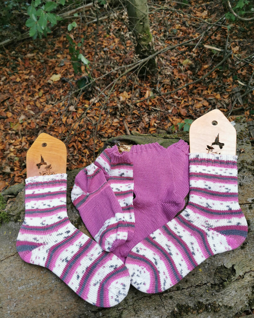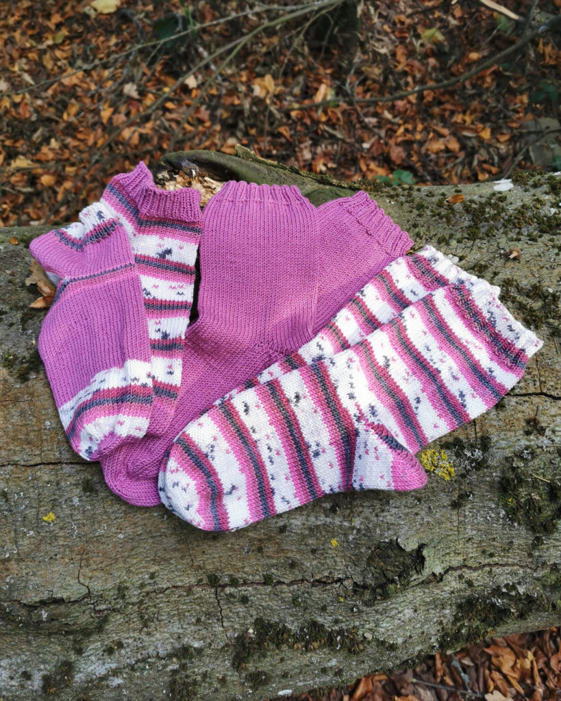 Heraus kamen 2 Paar Socken für meine Mama und ein Paar Sneakersöckchen für mich, um das Garn auch selbst mal testen zu können. Auch was eventuelles Ausleiern und das Waschen betrifft. Ich bin wirklich angenehm überrascht. Sehr pflegeleicht und bisher kein Ausleiern.