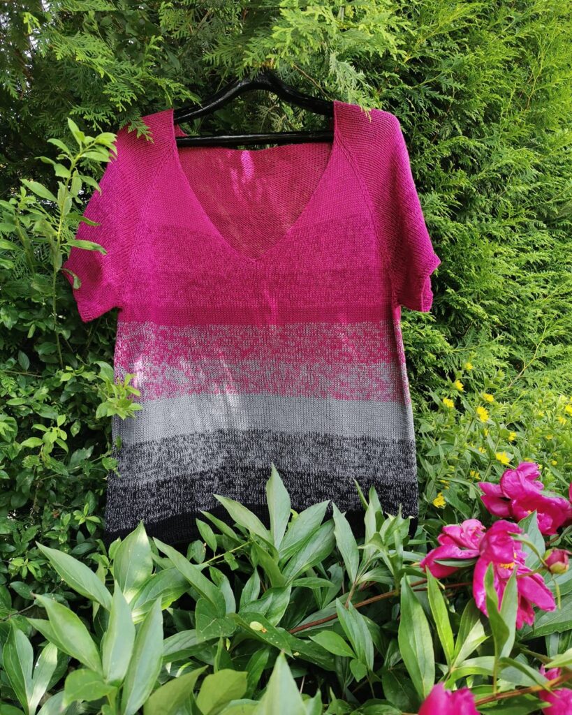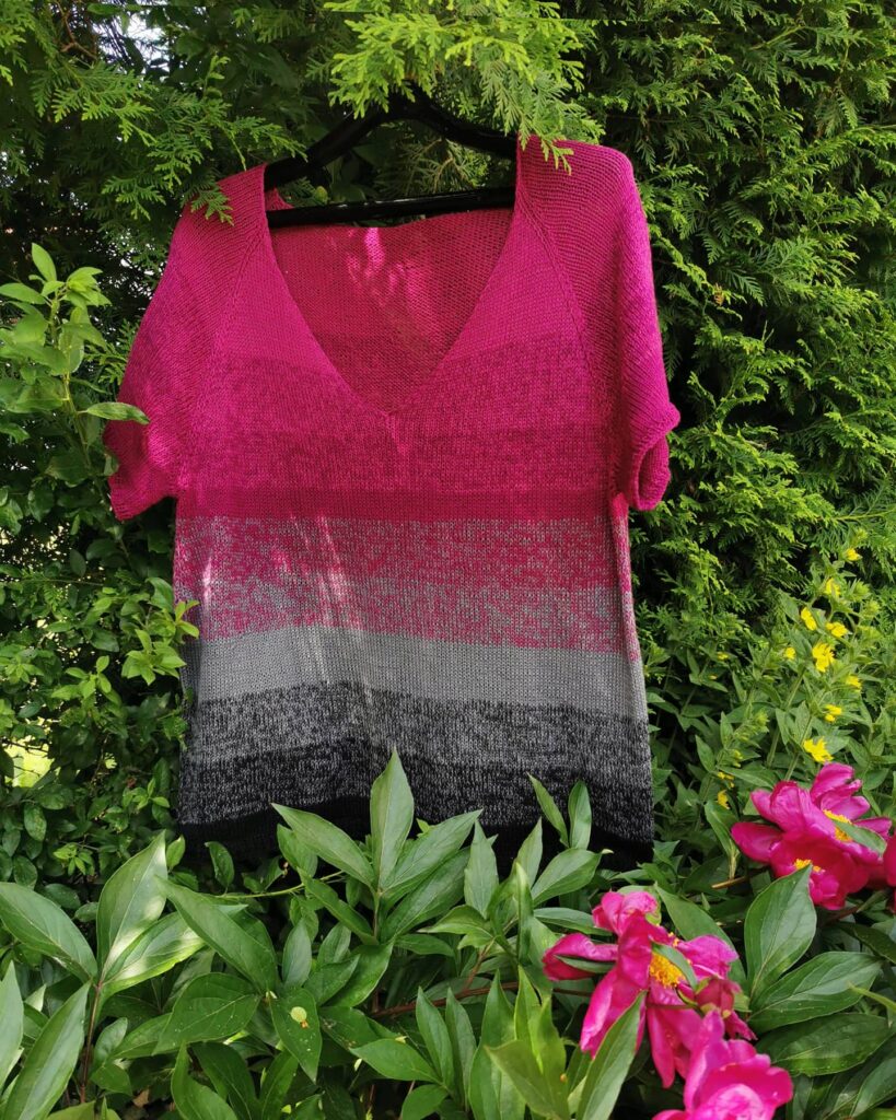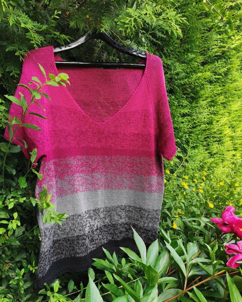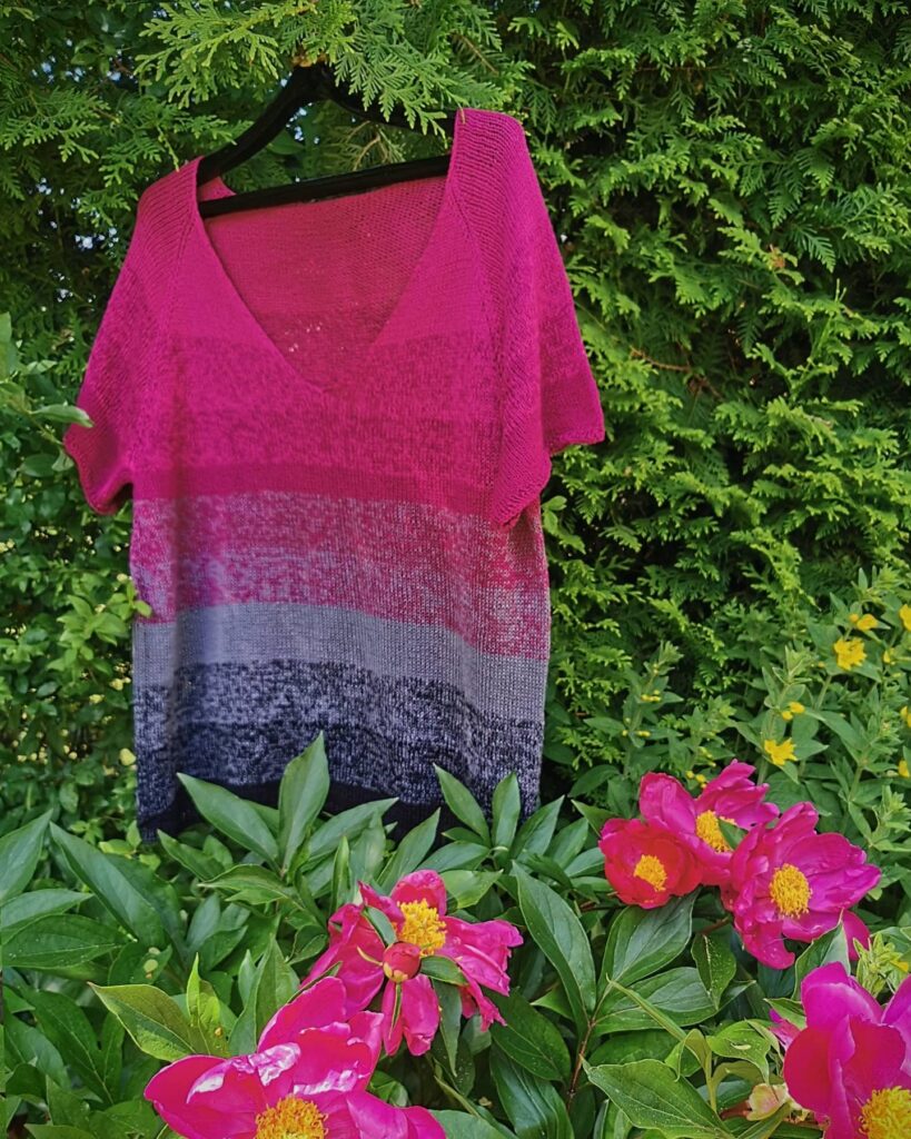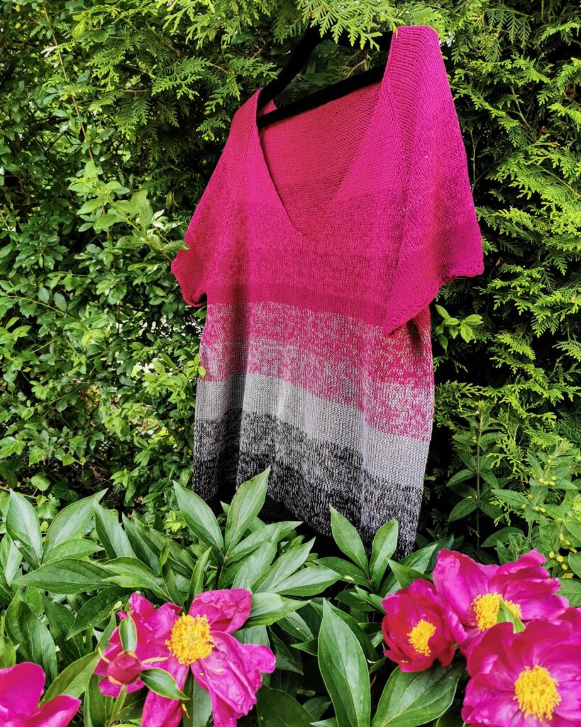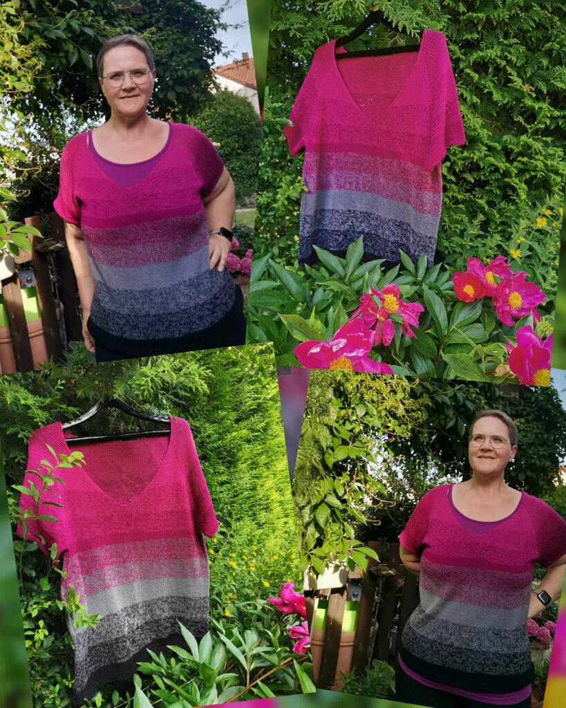 Mit den beiden Bobbeln habe ich nun nahezu alle Farben meiner Tops abgedeckt und kann munter drauf los kombinieren. Sobald ich aus beiden Bobbeln noch je eine Edie gestrickt habe, versteht sich. Den Anfang machte jedenfalls der pinke Bobbel. Der andere ist gerade frisch in Arbeit. 😉