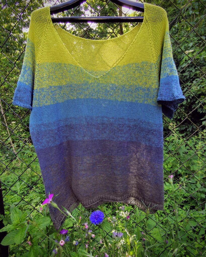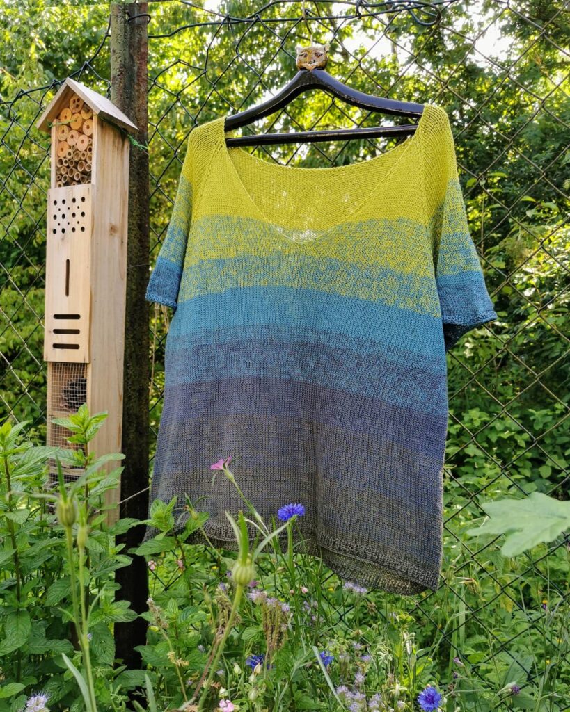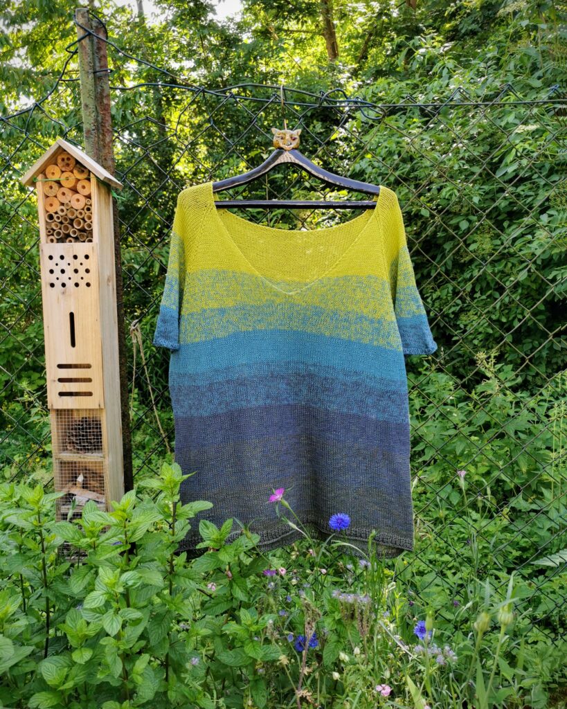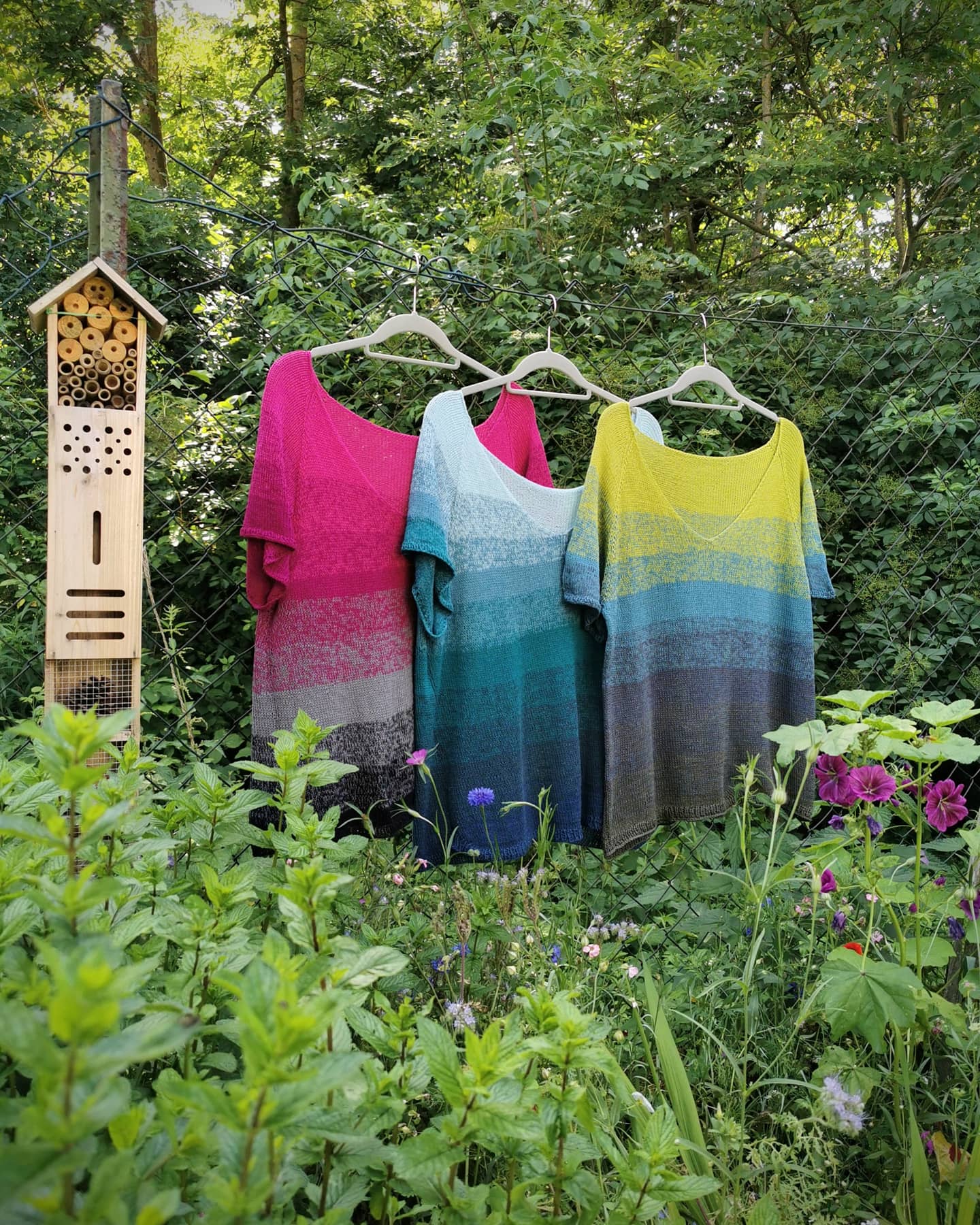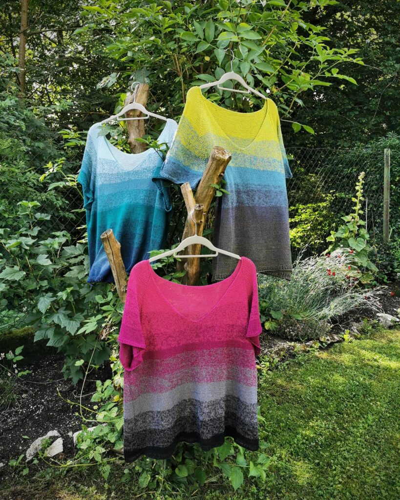 Das erste habe ich bereits letzten Sommer gestrickt, die anderen beiden in den letzten Wochen. Das pinke Shirt hatte ich hier ja bereits gezeigt. Ganz frisch von den Nadeln ist nun dieses hier…