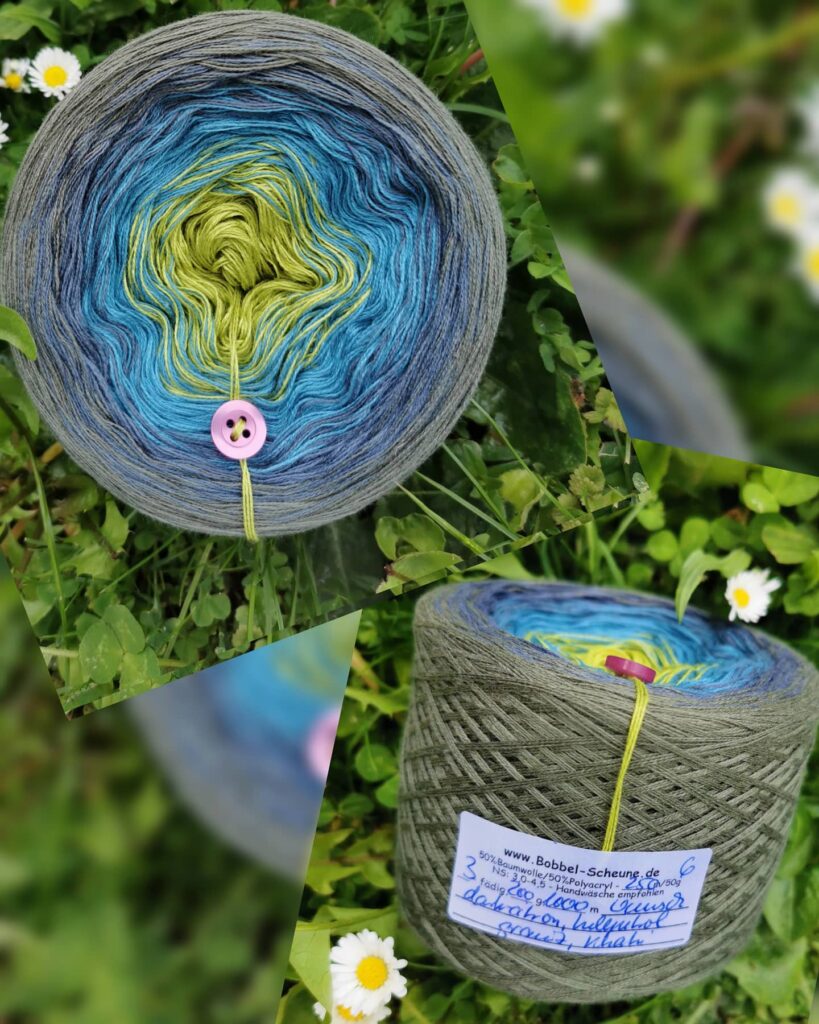 Wie schon im Beitrag zuvor erwähnt, habe ich mir die Bobbel von der “Bobbel-Scheune” auf deren Homepage selbst konfiguriert, genau nach meinen Farbwünschen. Ich liebe auch einfach dieses Garn aus Baumwolle und Poly (3fach mit 1000m/200g).