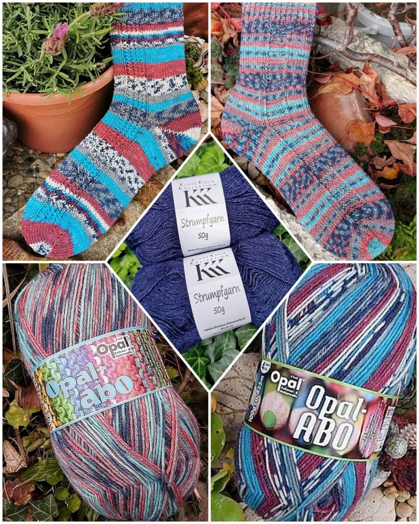 In der folgenden Collage sind die verwendeten Garne und die ursprünglich einzeln daraus gestrickten Socken zu sehen.