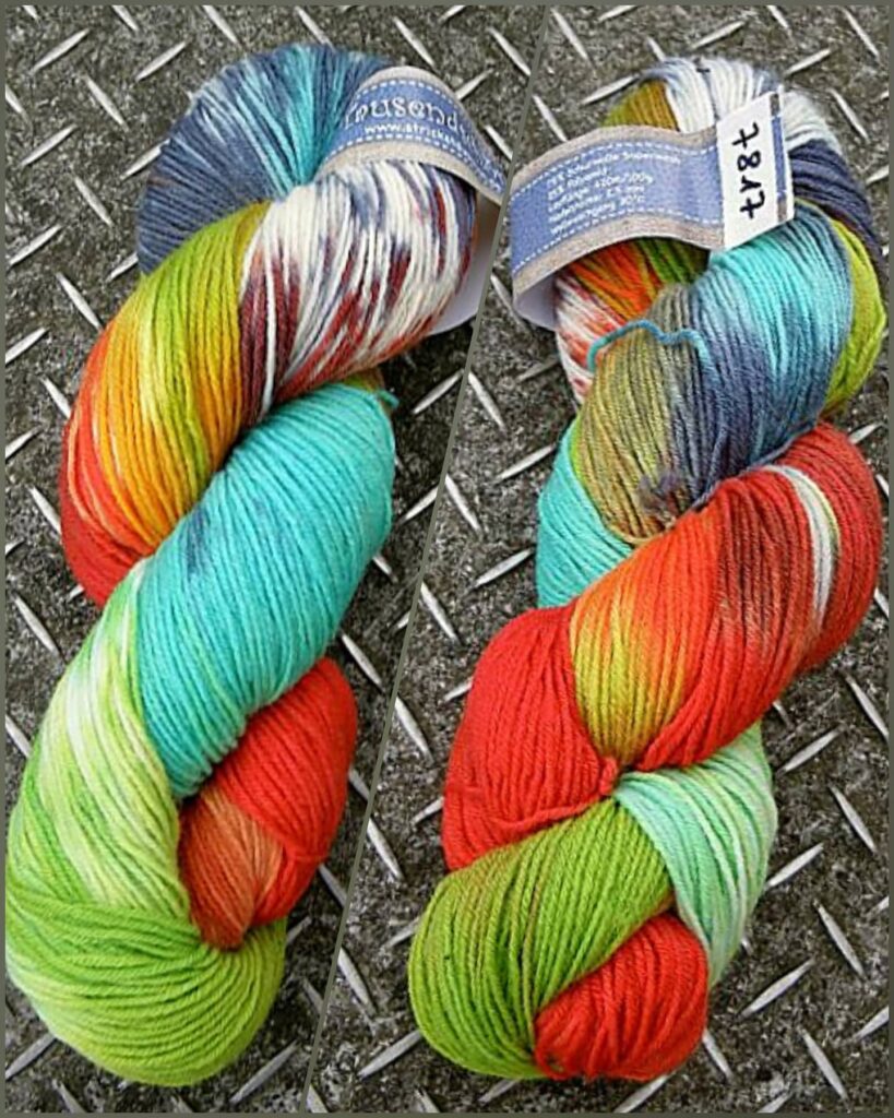 Das handgefärbte Garn ist von “Tausendschön” Wolle und ein sog. “Wilder” mit der Nummer 7817.