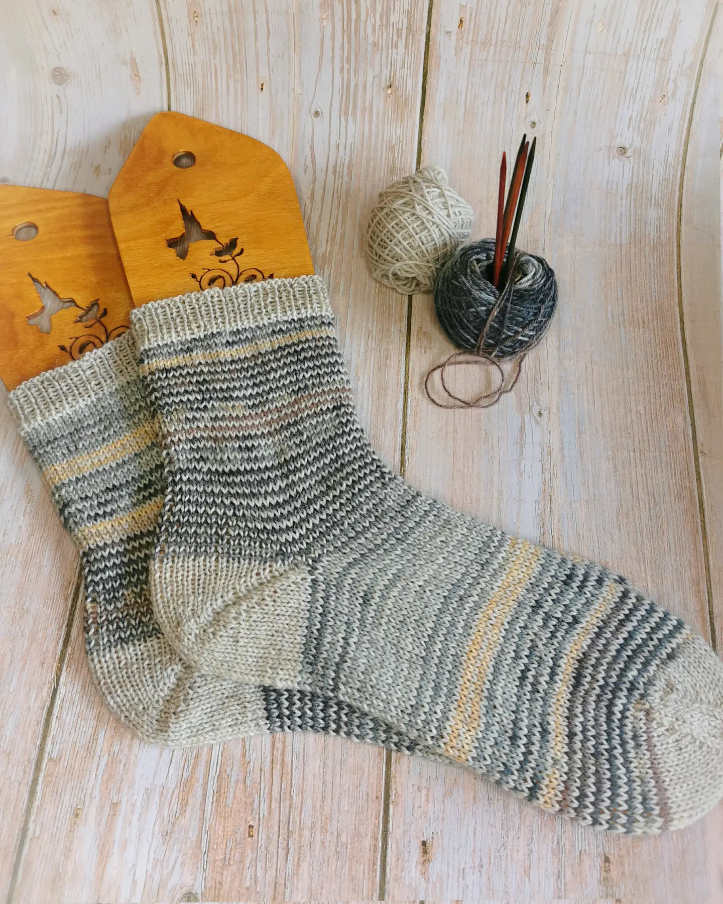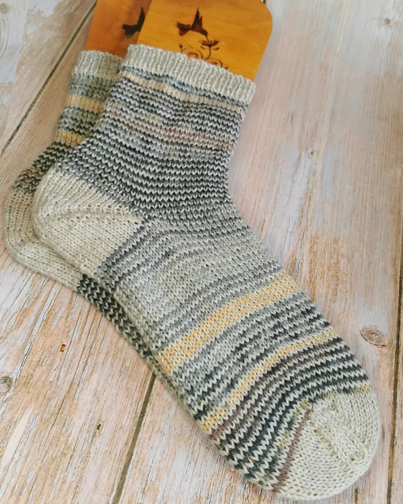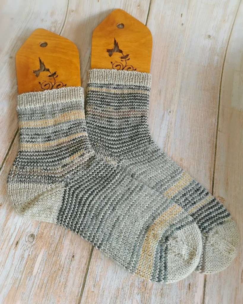 Das unifarbene Garn ist von Regia. Das gemusterte von Opal, aus der Gallery Collection “Wegweisende Lokomotive” Nr. 8886.
