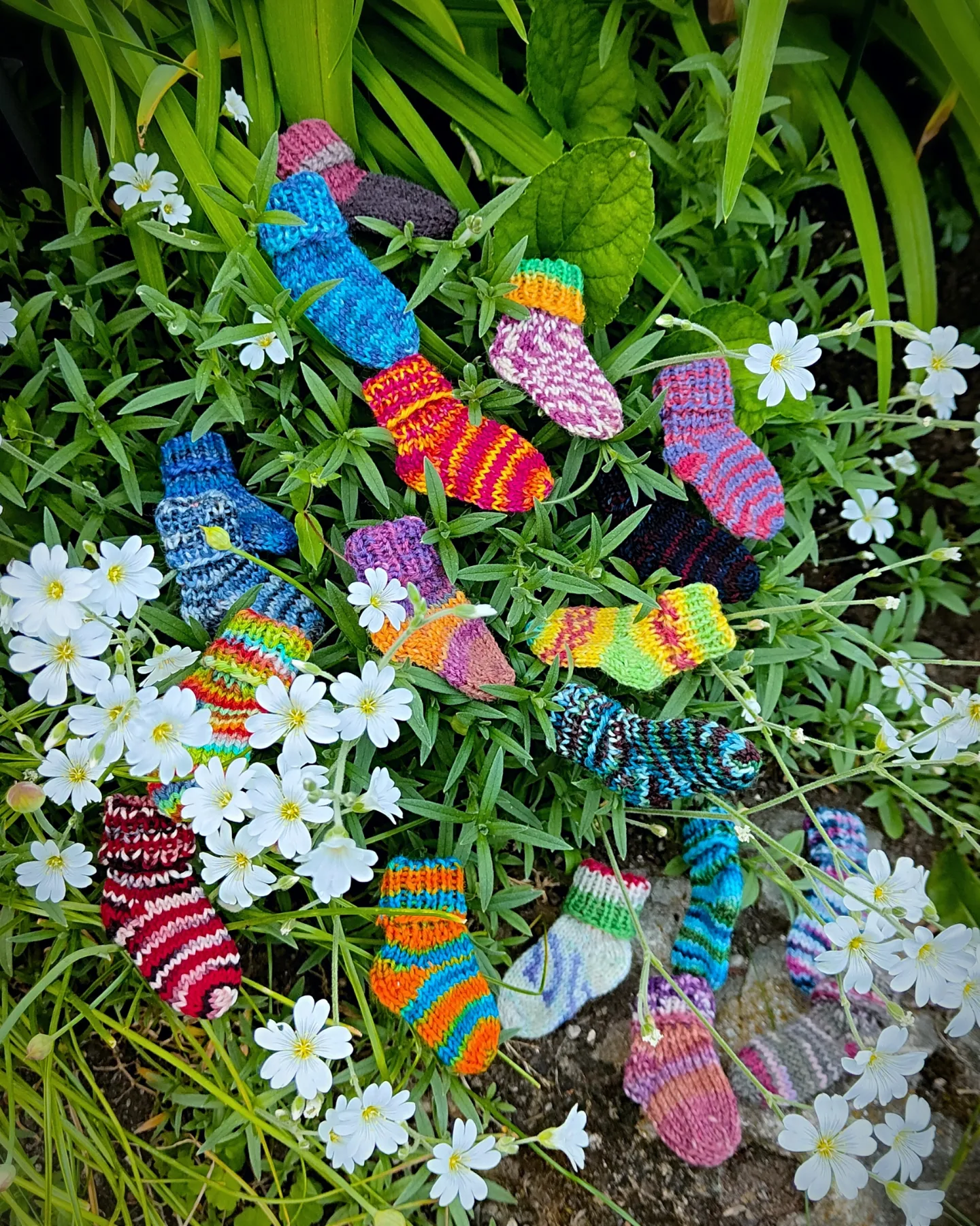 19 Minisöckchen als Schlüsselanhänger habe ich in den letzten Tagen gestrickt. Als kleines Abschiedsgeschenk an meine wundervollen Mitpatient*innen und das tolle Team der Schmerzklinik, in der ich die vergangenen 4 Wochen sein durfte.