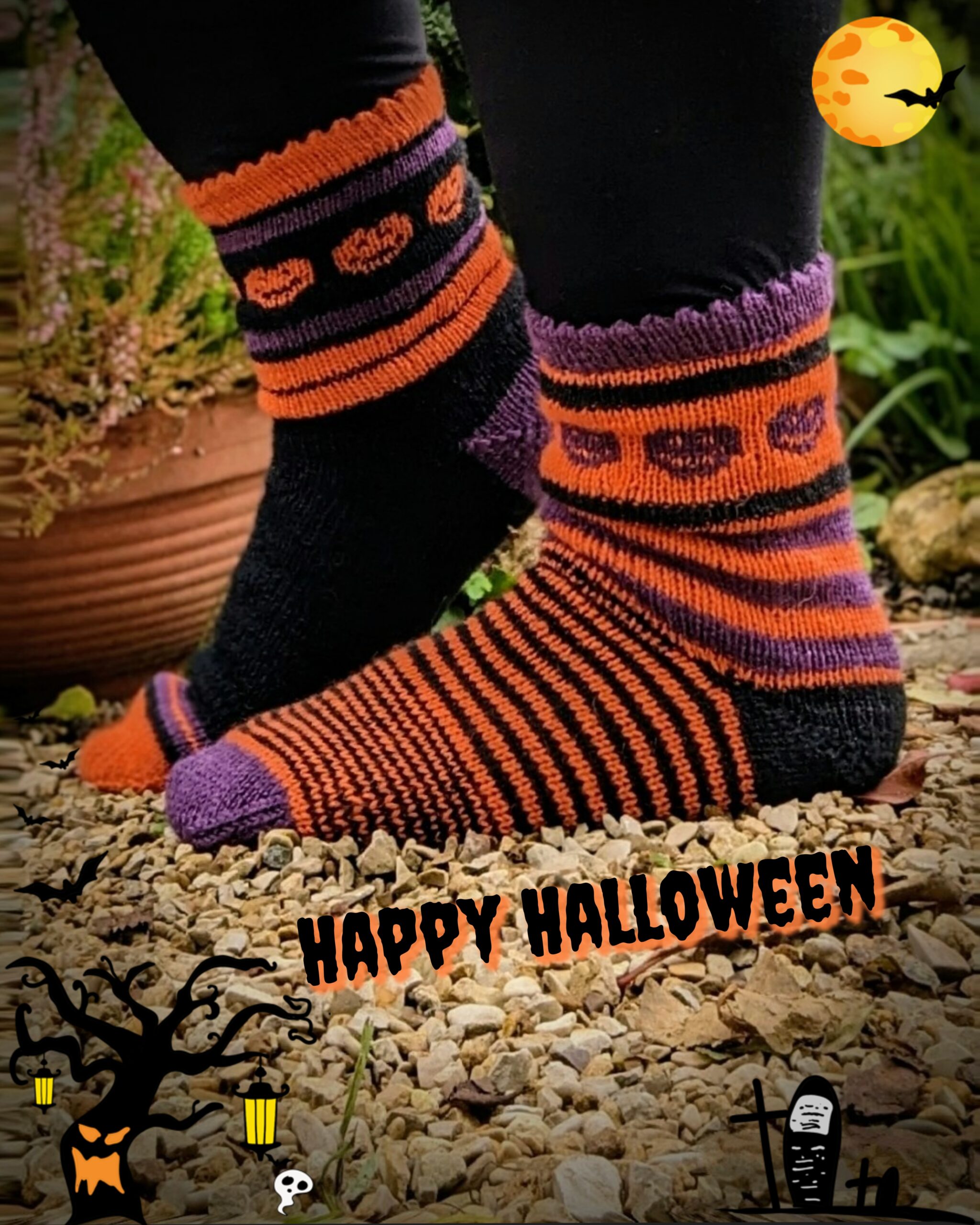 Mir war nach speziellen Socken zur Halloweenzeit, aber ich fand auf die Schnelle keine Anleitung die mir wirklich zusagte. Deswegen dachte ich mir selbst etwas aus, kritzelte dazu etwas auf einem Blatt Papier herum und hatte recht bald brauchbare Ideen. Letztendlich entwickelte ich meine Grundidee aber dann während des Strickens nochmal nach und nach weiter. Jedenfalls mag ich das Ergebnis sehr und sie werden ganz bestimmt nicht nur zu Halloween getragen.🙃