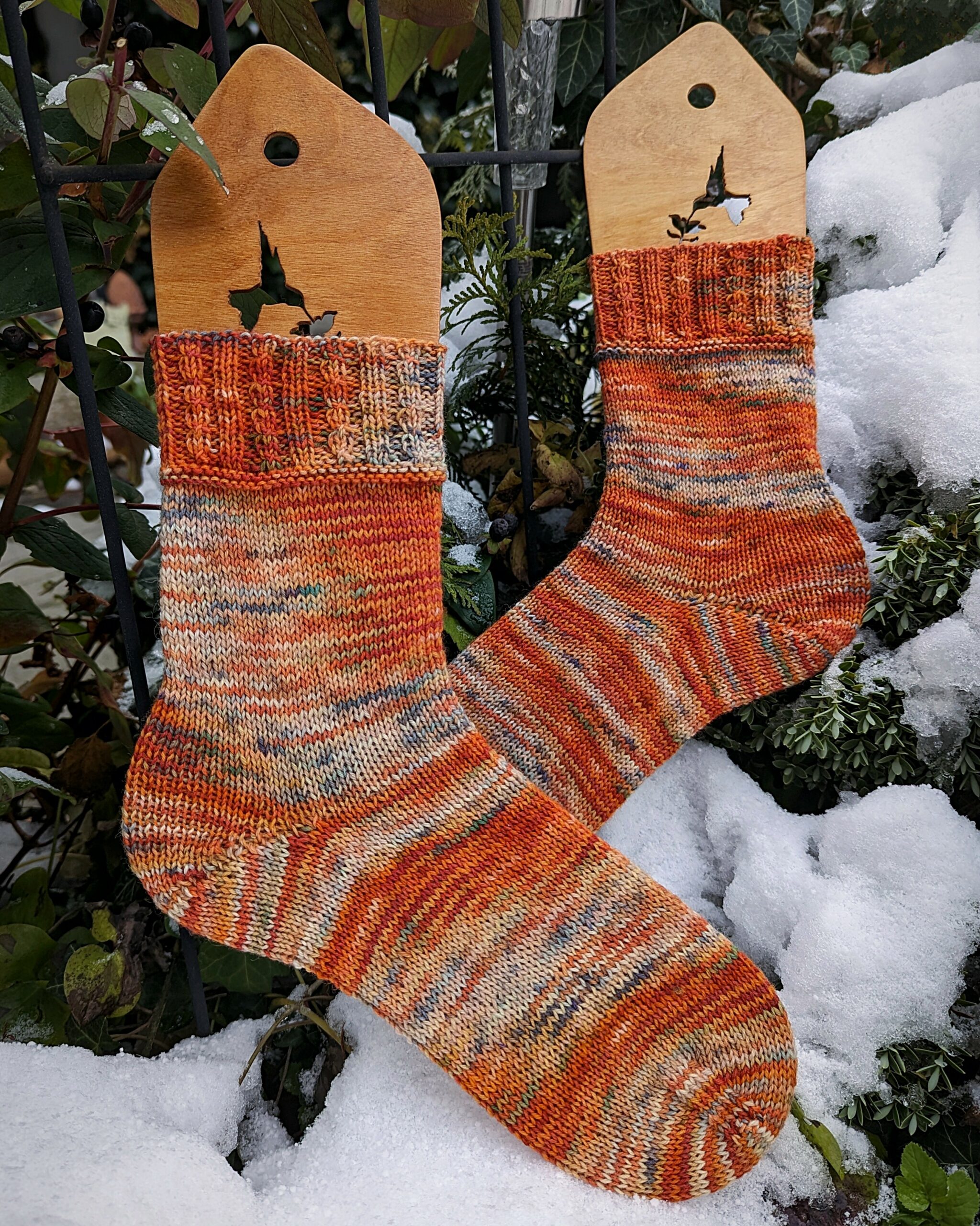 Hier habe ich einen weiteren Strang der wunderbaren “Zaubergarne” (Etsy) in ein Sockenpaar für mich selbst verwandelt. Auch dies wieder in den von mir so geliebten Herbstfarben. Die Färbung heißt “Halloween Town”, wie schon im Titel zu lesen ist.