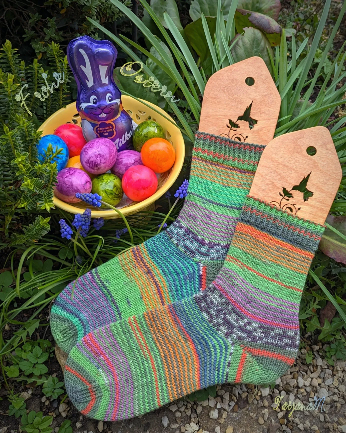 Pünktlich zu Ostern wurden diese frühlingsbunten Restesocken fertig. Wie so oft in der von mir bevorzugten “GumGum” Technik. Immer wieder überraschend was dabei heraus kommt.