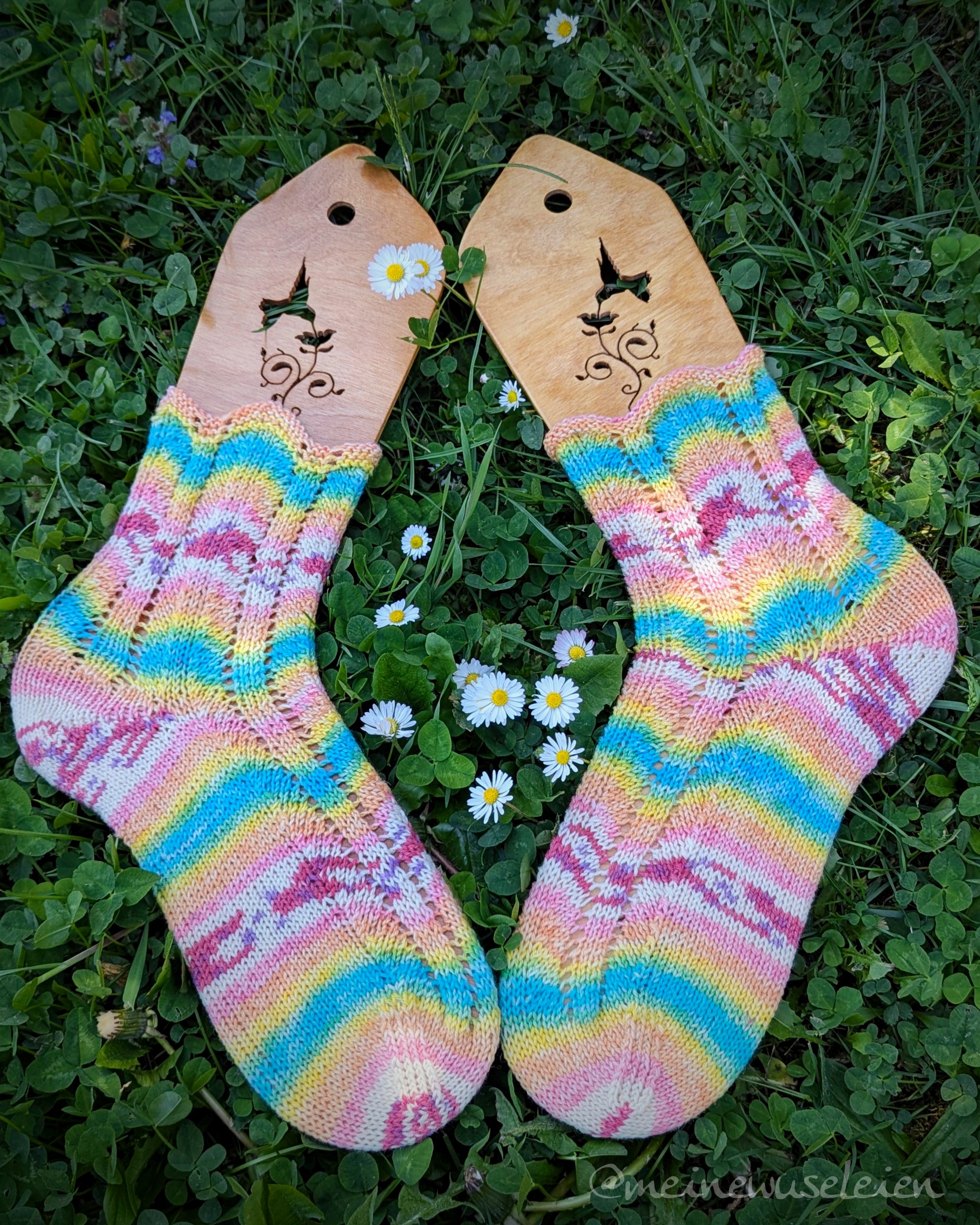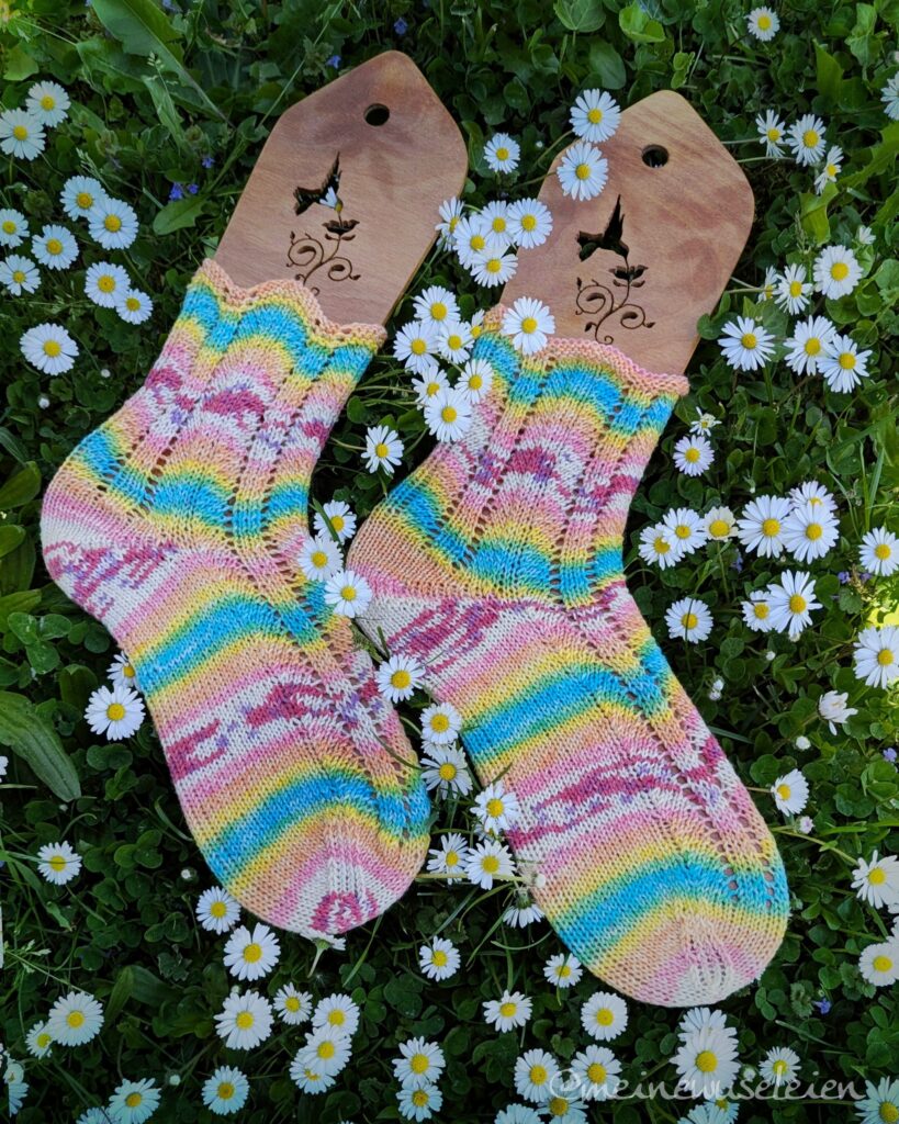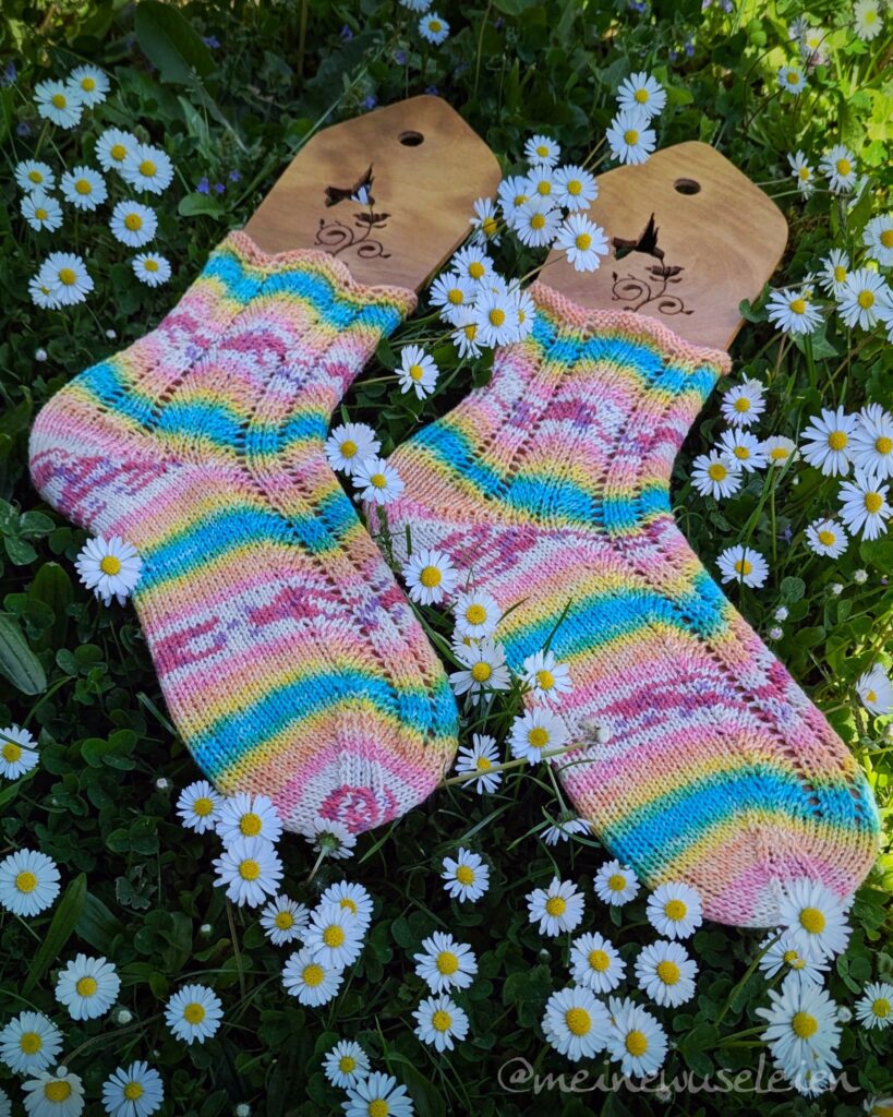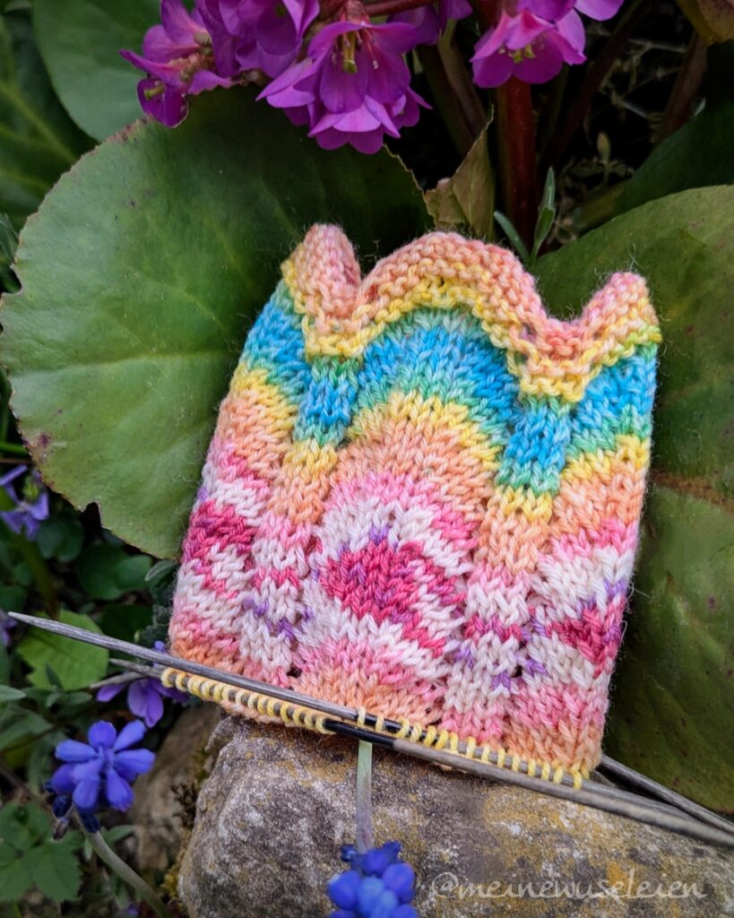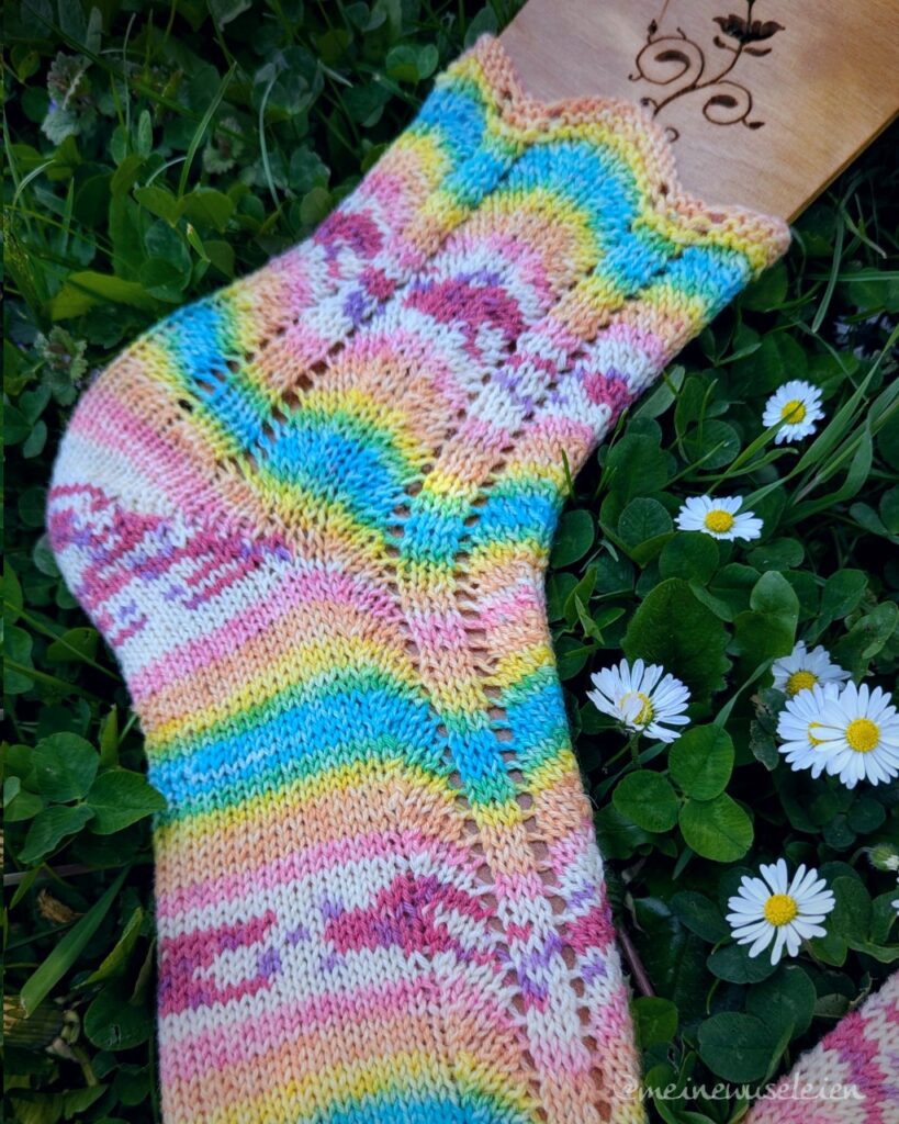 Ich mag dieses Muster besonders in Kombination mit streifender Sockenwolle, weil sie dieser einen verspielten Touch verleiht. Und in diesem Fall perfekt passend zum Frühling, in diesen tollen Pastelltönen.🩵💛🩷