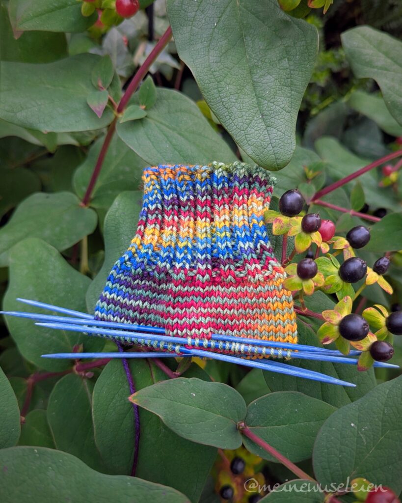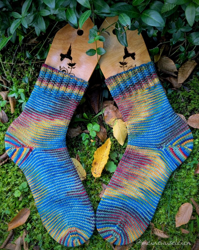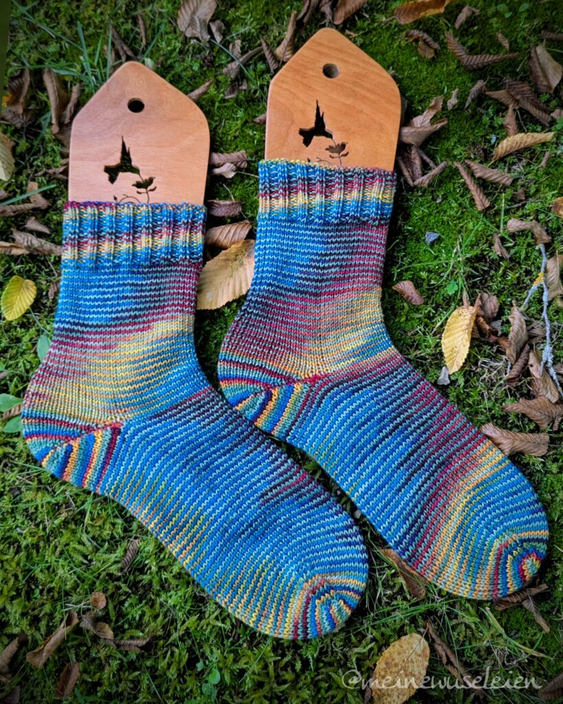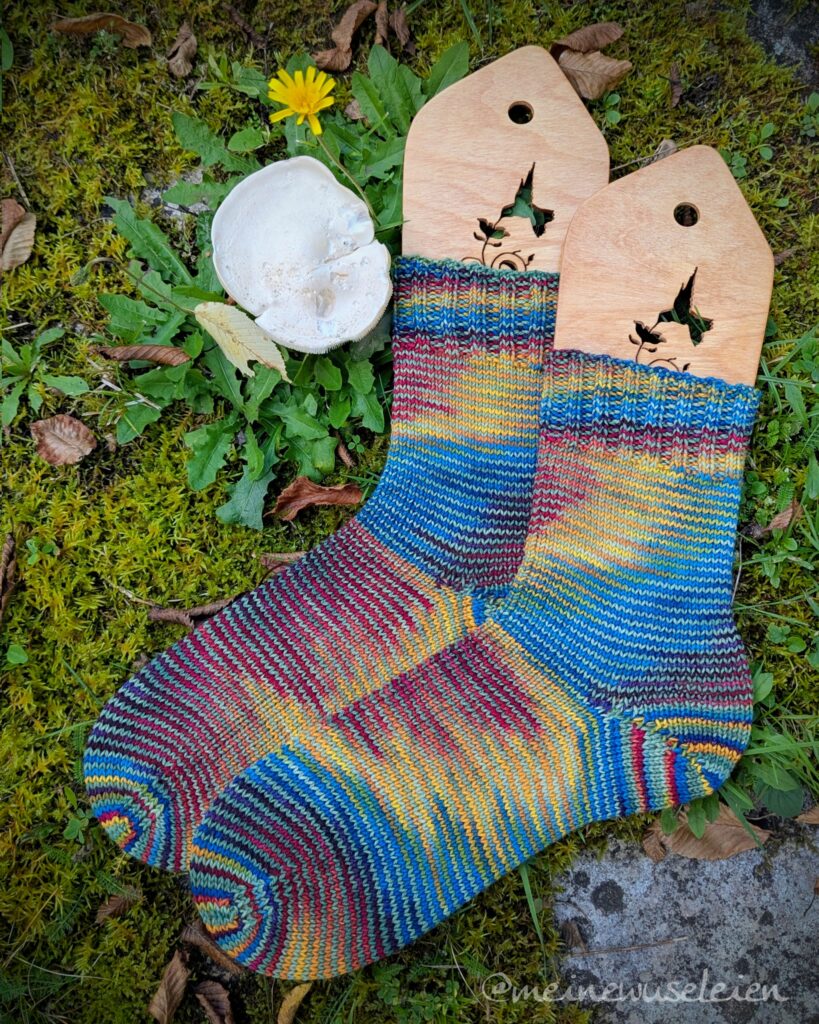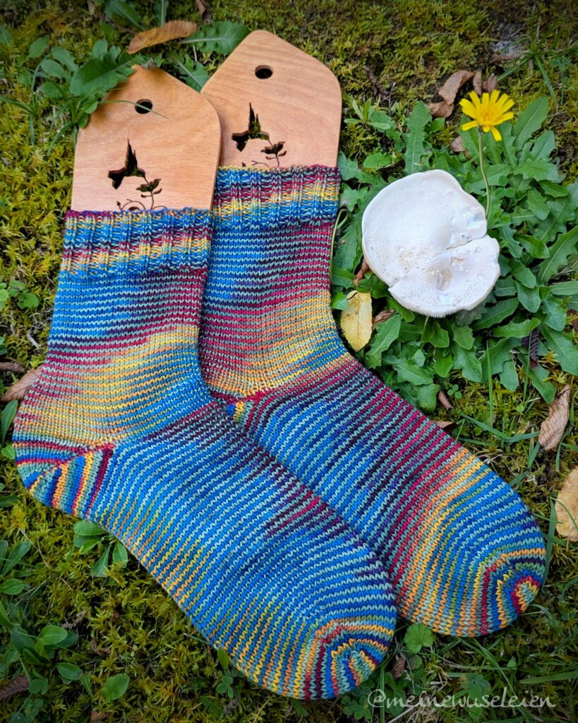 Ich wollte zumindest gewappnet sein, aber tatsächlich konnte ich nur am Nachmittag/Abend vor meiner Schilddrüsen OP etwas daran stricken. Danach ging es nicht, weil ich an beiden Händen Zugänge an Stellen gelegt bekommen hatte, mit denen es mir unmöglich war zu stricken. Wieder zu Hause hatte mich dann auch für ein paar Tage die Stricklust verlassen. Das kenne ich…war bei bisher jeder OP der Fall. Aber egal, nun sind sie fertig und auch wenn ich gerade in dieser Zeit kaum daran gestrickt habe…es bleiben trotzdem die Socken, die ich immer damit in Verbindung bringen werde. Und das ist auch gut so. Es ist eine gute Erinnerung, die auch symbolisch für mich immer damit in Verbindung stehen wird wieviel Glück ich hatte (ohne hier jetzt mehr ins Detail gehen zu wollen). 🙏❤️
