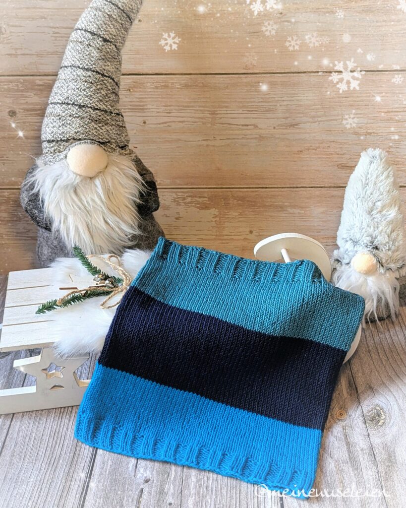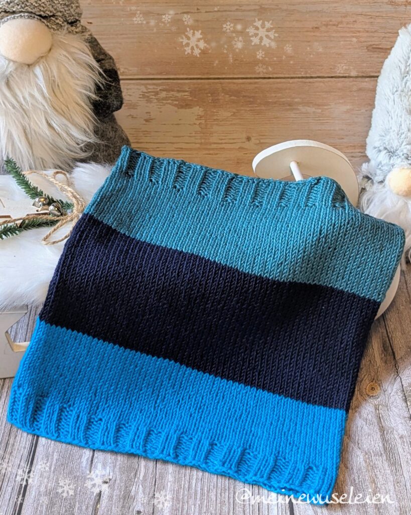 Gestrickt habe ich mit den Resten der Mütze, der Baby Merino von Drops in den Farben 32, 13 und 47. Ich habe mit 3,5mm Nadeln 110 Maschen angeschlagen. Je 9 Runden im Bündchenmuster (3 rechts, 2 links). Elastisch abgekettet. Mit jeder Farbe habe ich ca 27 Runden gestrickt. Der Verbrauch lag pro Farbe bei rund 17g. Also 51g insgesamt.